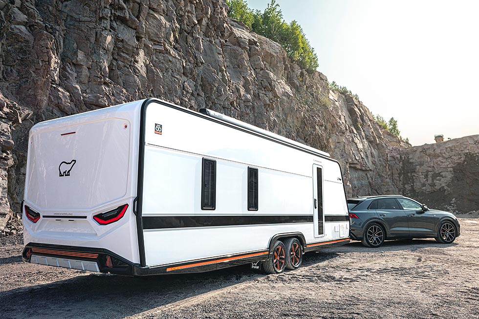 – Polars jubileumsvogn Black Line 730 er en moderne premiumvogn med retroelementer, forteller Tony Ekström, administrerende direktør i Polar. – Vi har laget et luksuriøst og fullt utstyrt feriehus med alle slags fasiliteter, som vi tror vil få våre kunders hjerter til å banke litt ekstra. Den romslige vogna Polar Black Line 730 fås med to planløsninger og har et luksuriøst interiør, med blant annet dobbelt kjøleskap, vitrineskap, stekeovn i full størrelse og mikrobølgeovn og hjørnekjøkken. Interiøret og utformingen av skapene og dørene er helt nye, og tekstilene er i unikt jubileumsdesign. Den utvendige folieringen er meget karakterfull med en oransje dekorativ farge som følger karosseriet. Jubileumsserien inkluderer også Blue Line med tre vogner i ulike størrelser og oppsett, som alle representerer Polars stikkord om kvalitet og komfort.