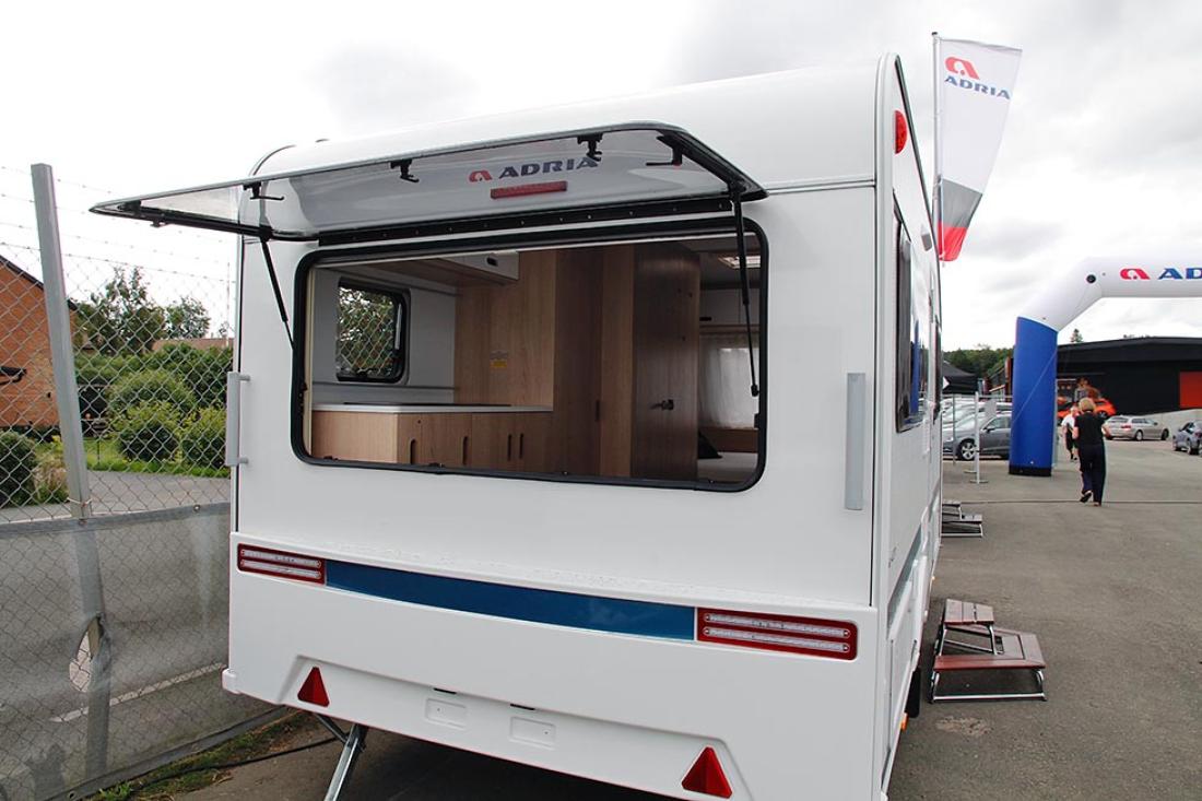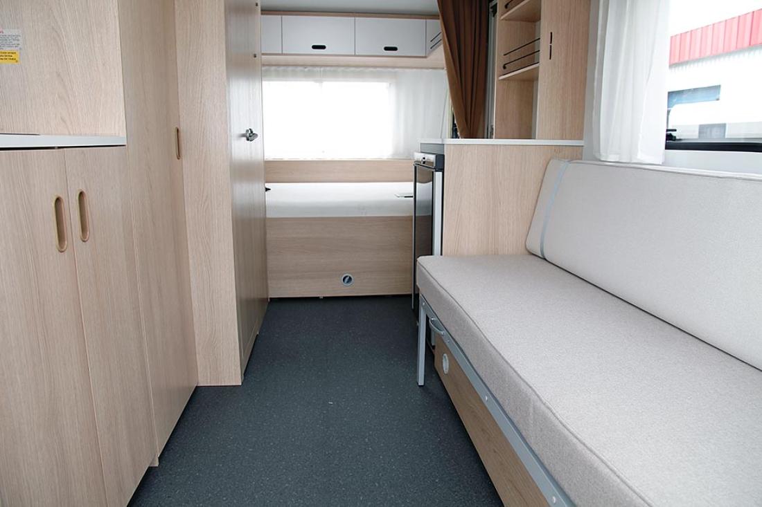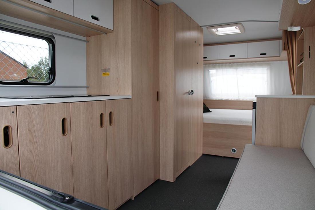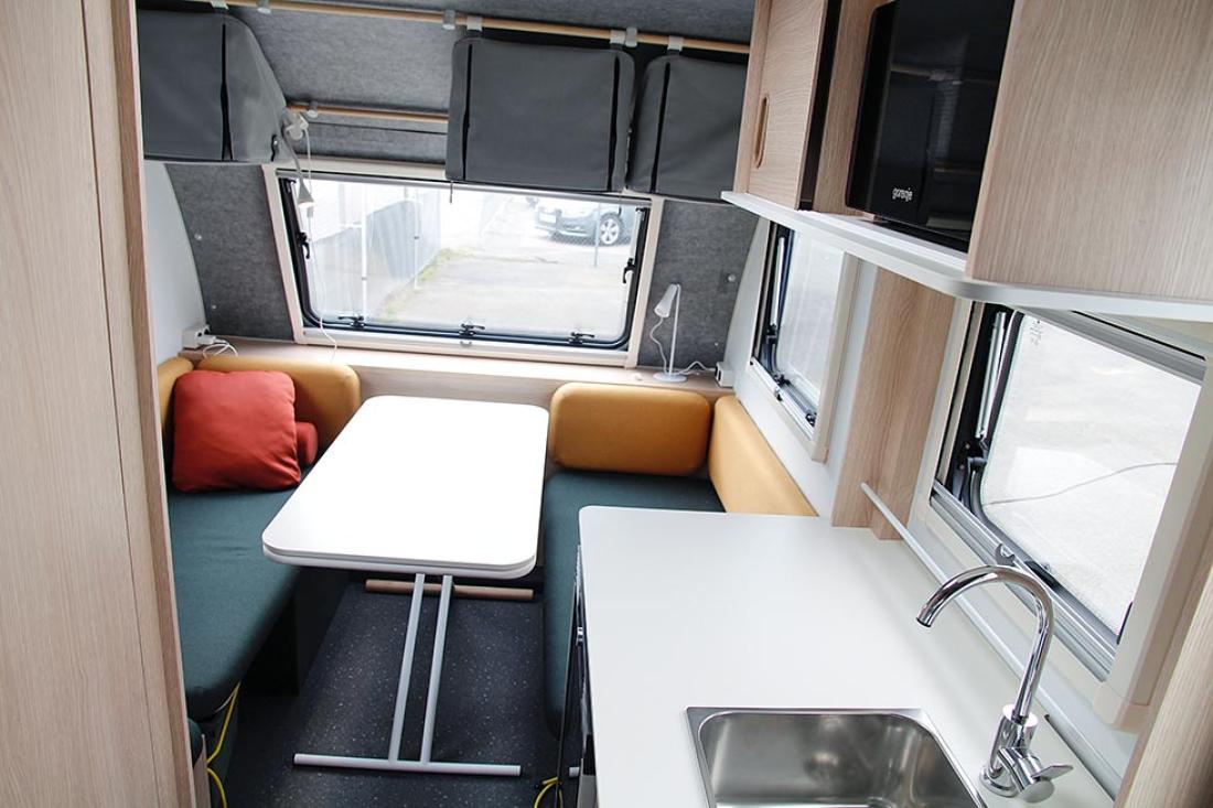 Dette er en modell som har vært på markedet tidligere, men i 2024-utgave er det en helt ny vogn innvendig. Selv om også dette er en kompakt vogn har den en romslig følelse innvendig. I tillegg er det flere praktiske løsninger, som at sofaen kan gjøres om til en 90 cm bred seng. Dermed er det soveplass til tre i kombinasjon med en tverrstilt dobbeltseng. Men det som gjør at denne modellen skiller seg ut er det stooore vinduet som kan åpnes helt opp. Det gjør at skillet mellom naturen der ute, og kjøkkenet og bordplassen inne nærmest blir visket ut. Modellen har både en Truma luftvarmer og en koketopp på gass. Og ikke minst er det meget lyst og trivelig.