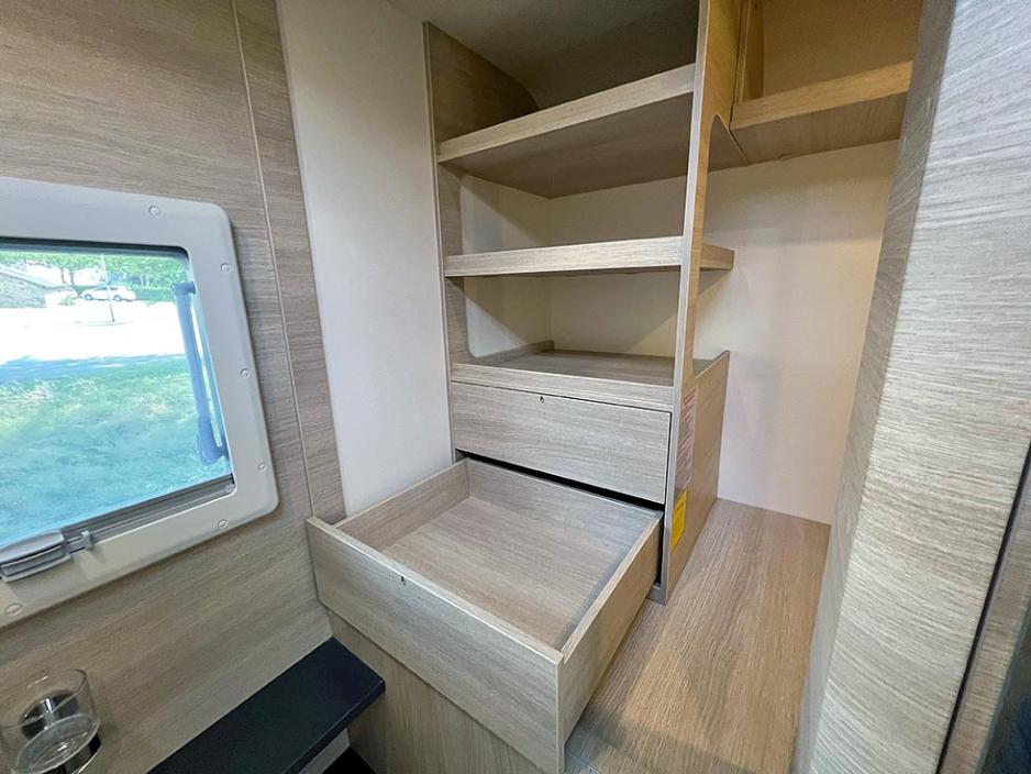 Enda mer oppsiktsvekkende er derimot garderobeskapet på bobilens bakvegg. Den er enorm, og inkludere skuffer og hengeskap. Alt skjules bak en speilvegg. Et av skapene kan også skyves sideveis. Løsningen minner om den man finner hos konkurrenten Challenger, men vi tør påstå at byggekvaliteten er et hakk opp på Rapido. Takket være en luke er det mulig å få tilgang til deler av garasjen innenfra.