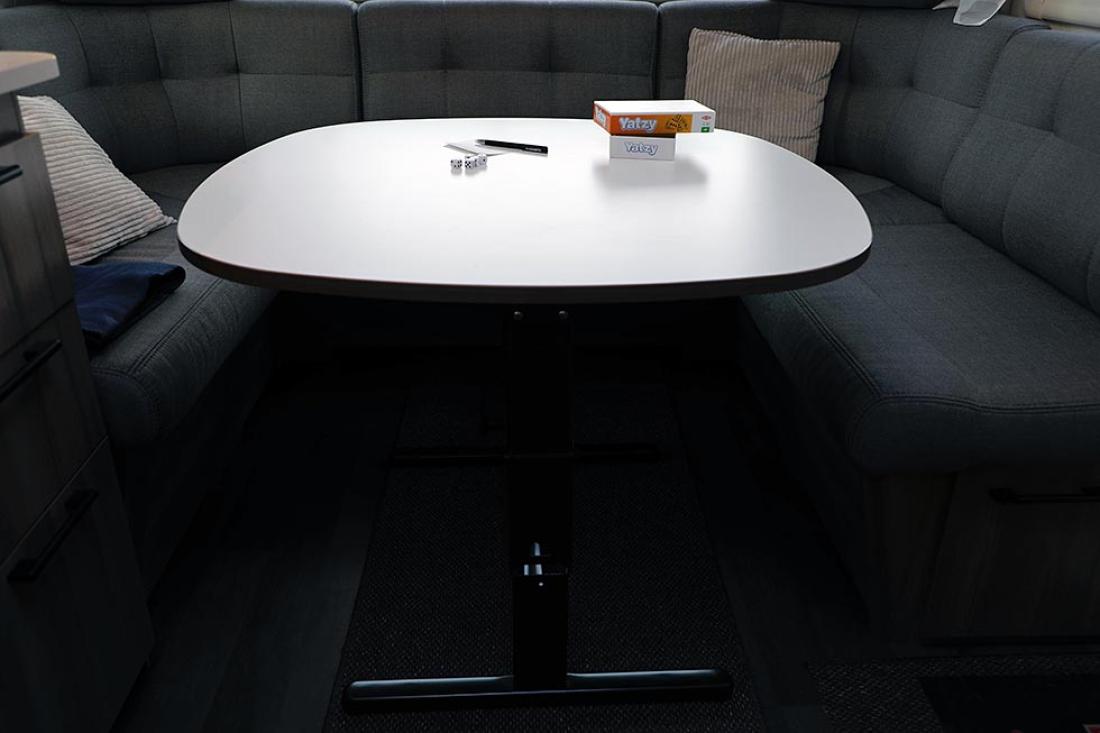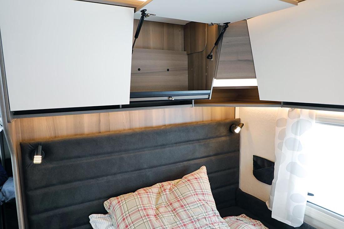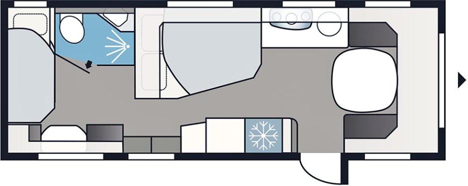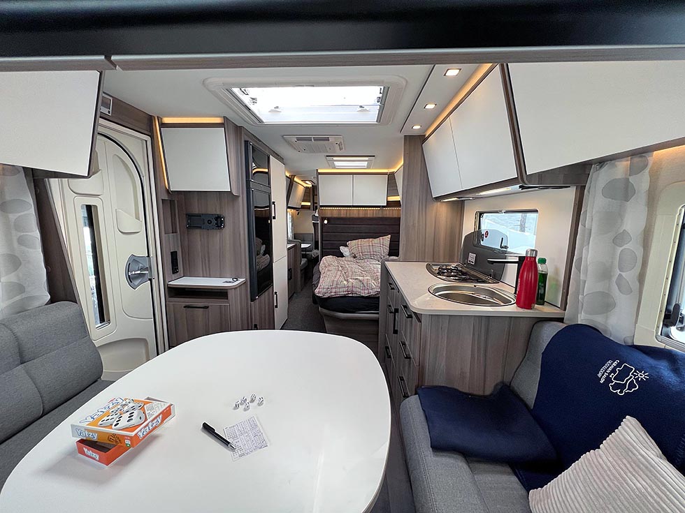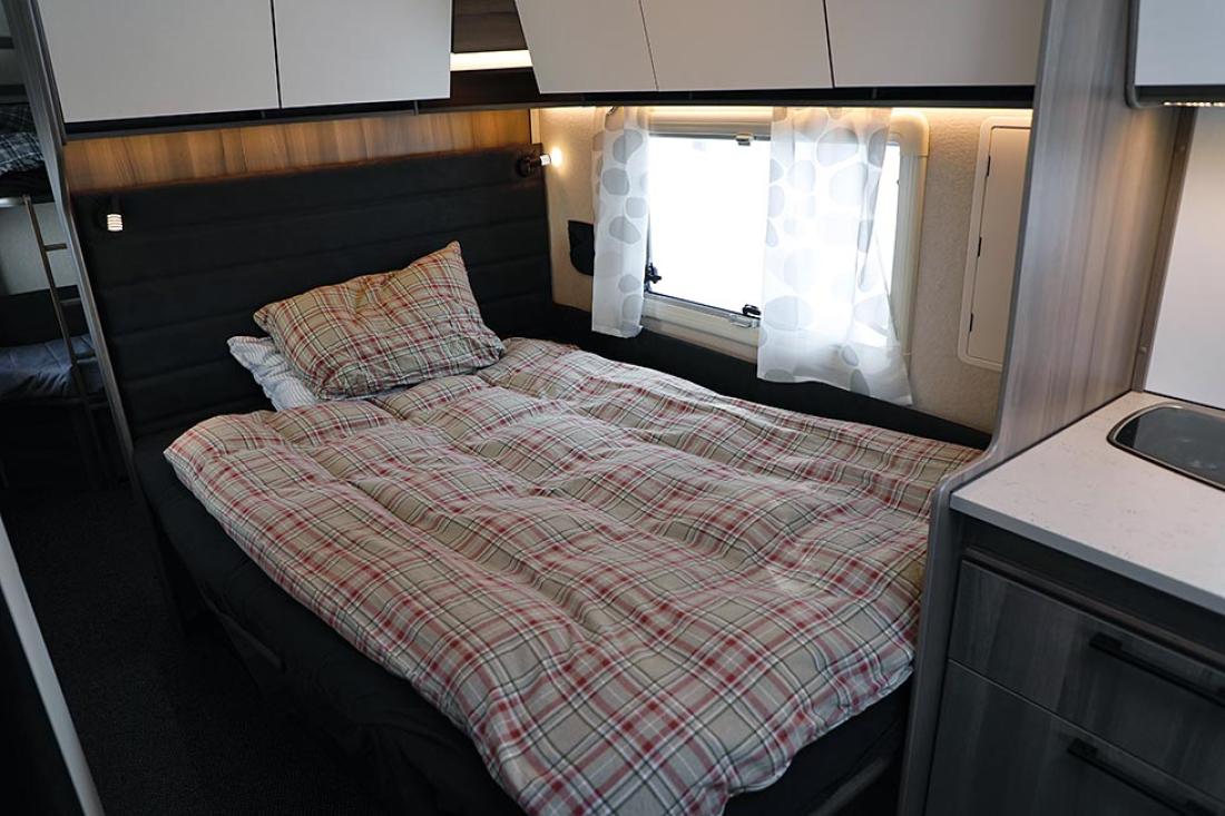 Det er på høy tid å presentere denne utgavens testvogn: Med smal dobbeltseng og køyeseng er dette en klassisk familievognløsning, for en familie med to barn. Modellen kan også fås med trippel køyeseng. Foran i vogna er det en deilig og romslig rundsitter. Store praktiske overskap bidrar til et trivelig innemiljø med sine matte hvite overflater. Rett ved er kjøkkenet og inngangsdøren. Så kommer hovedsengen, som er en langsgående dobbeltseng som smalner i fotenden. På andre siden av denne er kjøleskap og andre skap, og her passerer man for å komme til badet. Helt bakerst ligger barnerommet. Her er det normalt to køyesenger, men det er også mulig å bestille vognen med tre. Her er også en liten morsom sittegruppe. Ypperlig plass hvor barna kan sitte med tegnebok eller Lego.