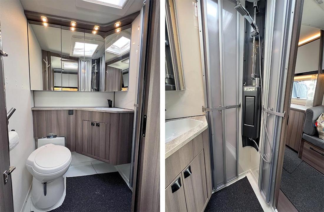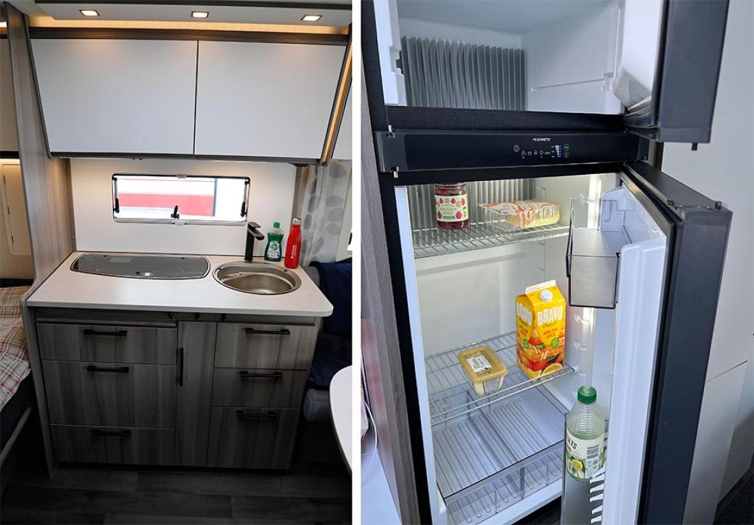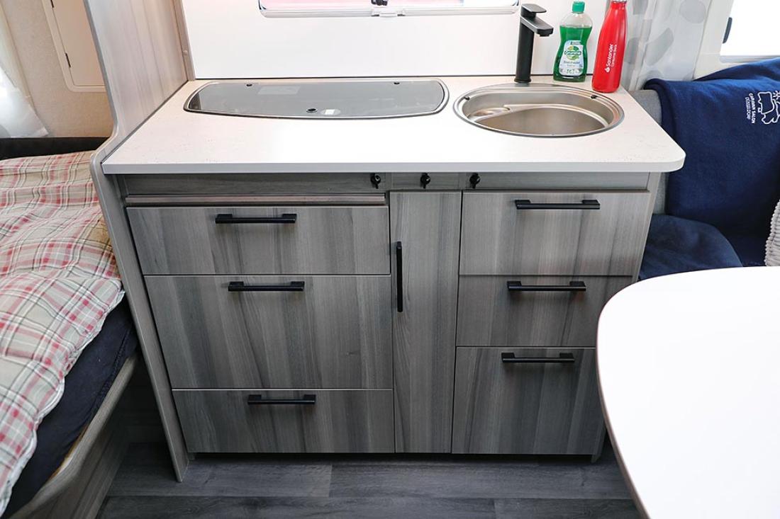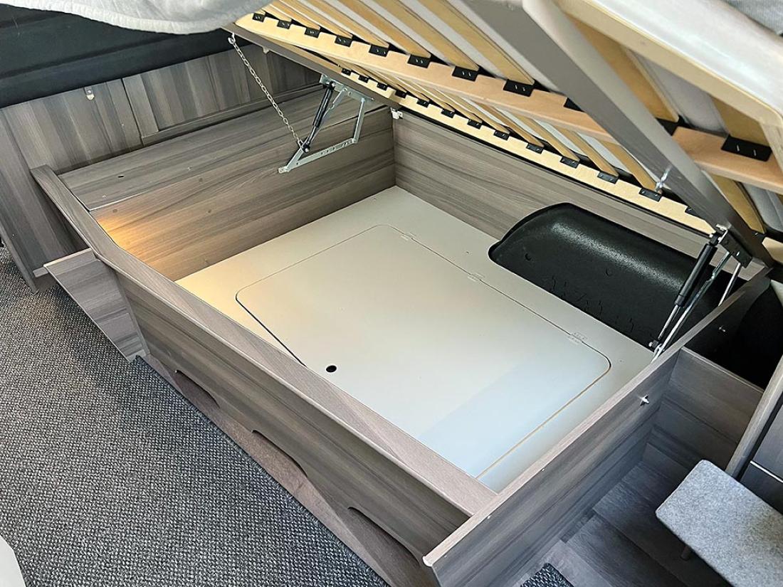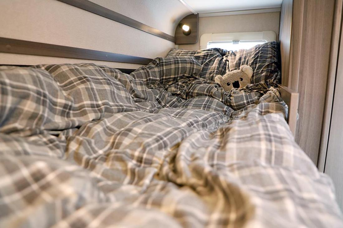 Det er på høy tid å presentere denne utgavens testvogn: Med smal dobbeltseng og køyeseng er dette en klassisk familievognløsning, for en familie med to barn. Modellen kan også fås med trippel køyeseng. Foran i vogna er det en deilig og romslig rundsitter. Store praktiske overskap bidrar til et trivelig innemiljø med sine matte hvite overflater. Rett ved er kjøkkenet og inngangsdøren. Så kommer hovedsengen, som er en langsgående dobbeltseng som smalner i fotenden. På andre siden av denne er kjøleskap og andre skap, og her passerer man for å komme til badet. Helt bakerst ligger barnerommet. Her er det normalt to køyesenger, men det er også mulig å bestille vognen med tre. Her er også en liten morsom sittegruppe. Ypperlig plass hvor barna kan sitte med tegnebok eller Lego.