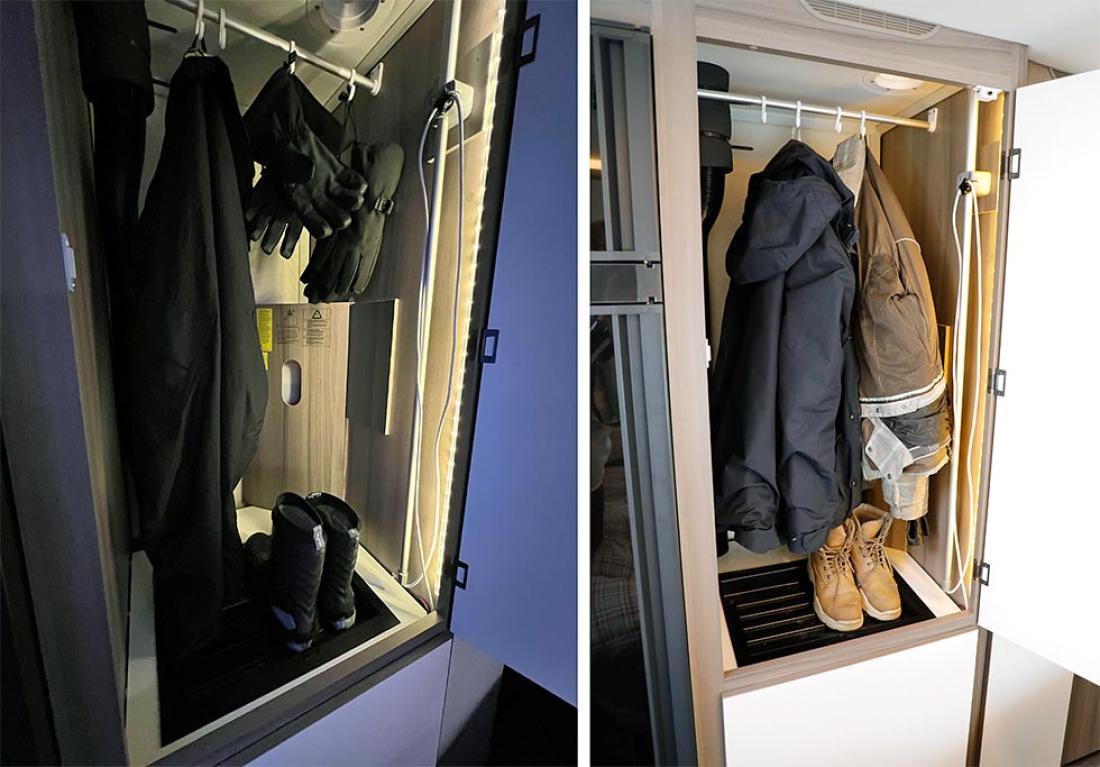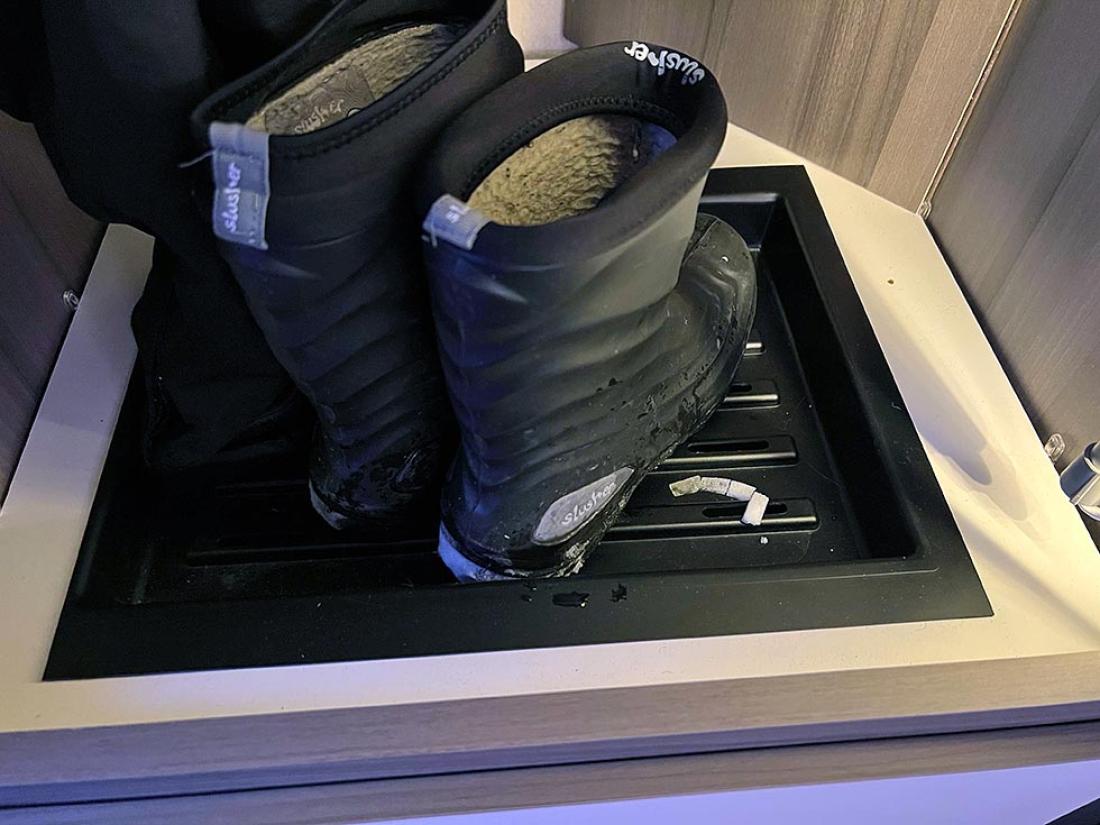 Inneklimaet i Estate 660 DGDL var topp. Her var ikke for fuktig, til tross for en del våte klær. Og viktigst av alt, varmen var god og jevnt fordelt. Praktiske detaljer som tørkeskap er superviktig for en vintervogn. At vognen er både lekker og har smarte hverdagsløsninger var noe vi satt pris på i praksis. Vintercamping er en fryd, når alt er så godt tilrettelagt som vi opplevde det.
