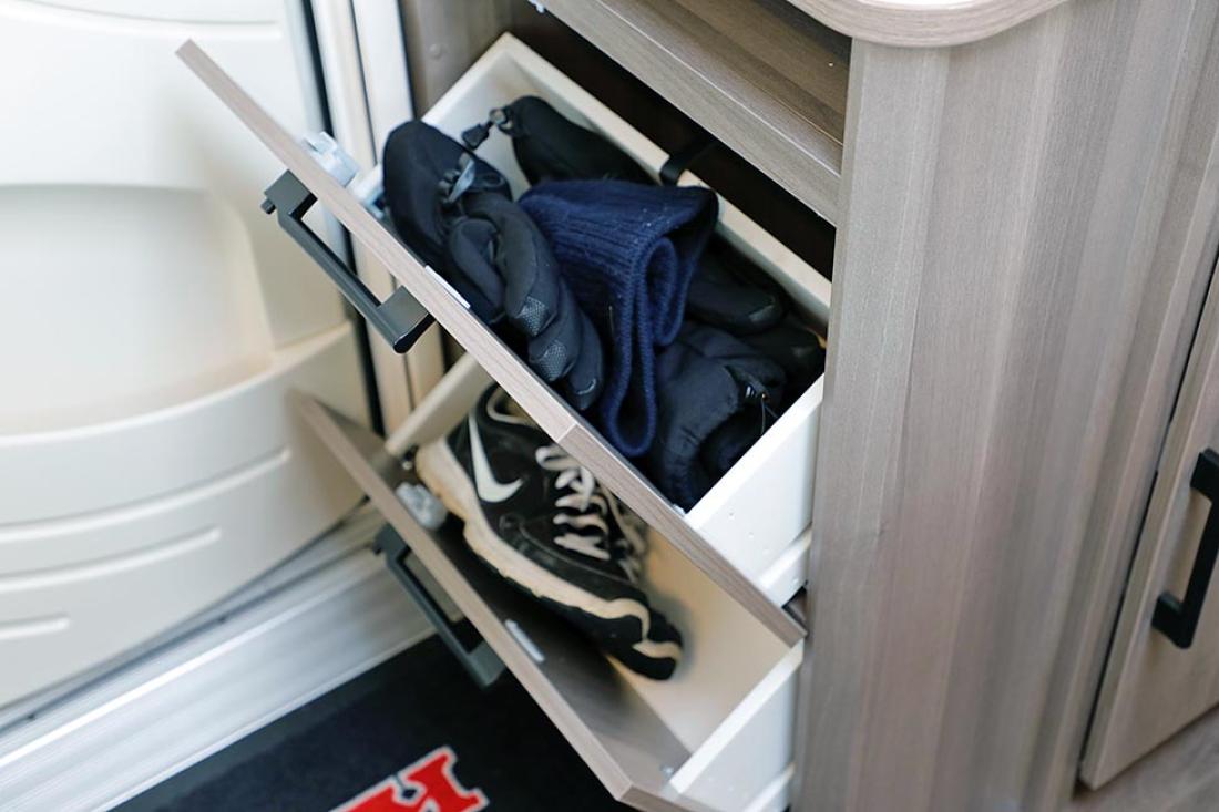 Vi er på skiferie, og etter en lang dag ute blir det gjerne en del vått tøy. Det har Kabe tenkt på, ved at et skap er oppvarmet, har god ventilasjon og en dryppmatte nederst. Det betyr at du kan sette fra deg skistøvler, henge opp jakker, lue og votter og de er både tørre og varme neste morgen. Luksus!
