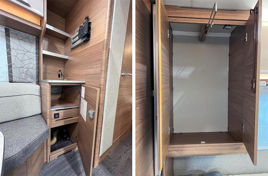 Over fotenden av sengene er plassen utnyttet til å utvide kjøkkenbenken på den ene siden, og å plassere et hengeskap på den andre siden. Sistnevnte har god plass til klær på kleshengere.