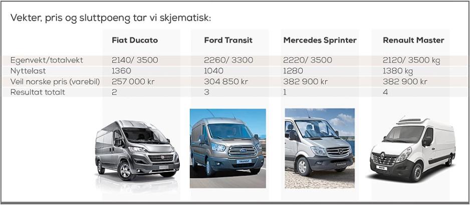 Mercedes Sprinter har en gjennomarbeidet konstruksjon, mener Promobil. Tross høyere pris har fabrikken trukket det lengste strået nesten hele veien med mange gjennomarbeidede detaljer. Ford Transit kommer mer i klasse med Fiat og Renault, men har flere gode løsninger hvor Fiat Ducato får kritikk. Den blir en sterk konkurrent til Fiat som er spesielt prisgunstig og som er best forberedt for bobil. Renault Master har noen svakheter, men vil fortsatt være aktuell som basis for bobiler.