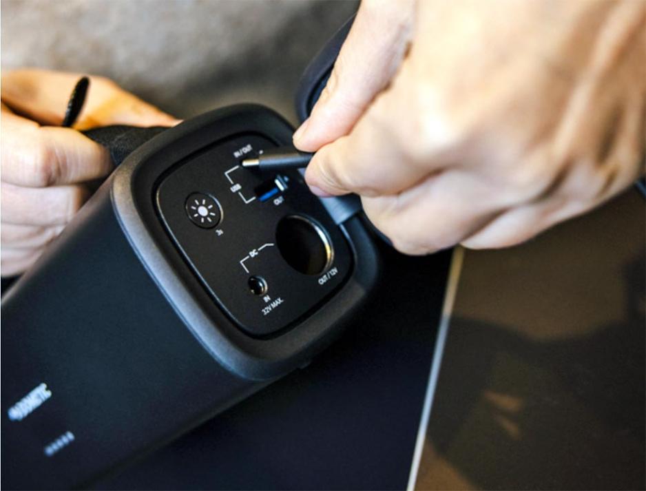 Du kan lade via 3 forskjellige utganger: 12V, USB-C eller USB-A