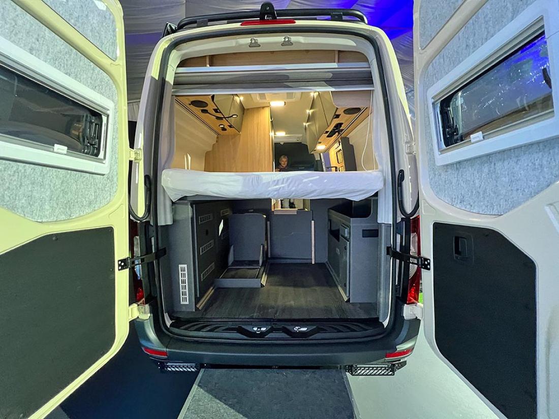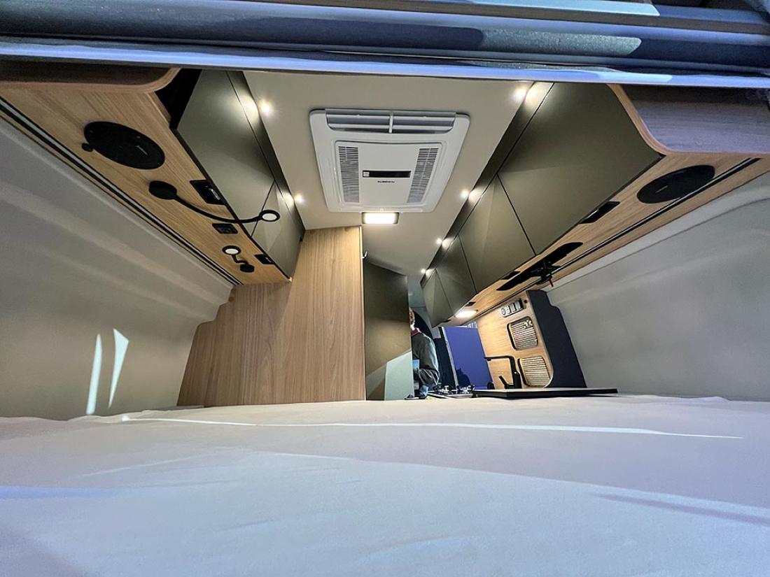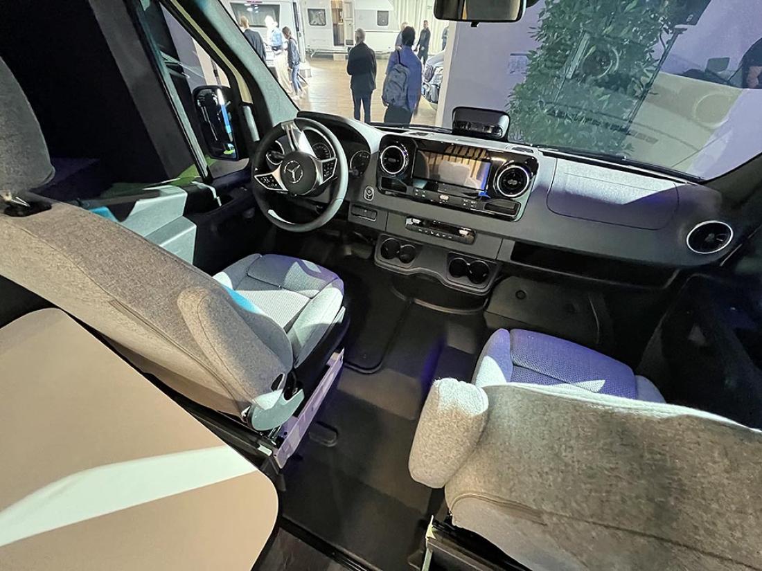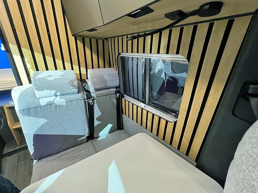 Veggene er delvis dekket av filt og delvis dekorert med smale trepanelstriper kombinert med svartlakkert metall. En uvanlig løsning, som ser både moderne og tøff ut. Selve interiørløsningen er en klassisk bybobilløsning med sittegruppe bak de vendbare forsetene, et kompakt bad med motstående kjøkken og en tverrstilt seng bakerst. For å få plass til å sove sideveis i Sprinter-chassiset er det bygget på bakerst på bilen på to sider. På venstresiden går denne «vorten» lenger ut enn på høyresiden, hvor skyvedøren trenger plass. Vi fikk aldri prøvd sengen, men av tidligere erfaringer er lengden god nok om du ikke er over gjennomsnittet lang. Det innvendige LED-lyset er spesielt forseggjort ifølge produsenten, og brukeren kan selv endre fargetone på innelyset.