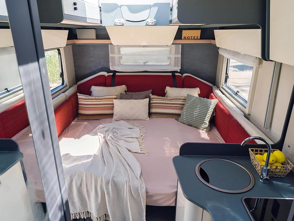 Senkesengen kan brukes som to enkeltsenger, eller du kan legge på en plate og få en gigaseng på 205/190 x 200 cm. Her kan du sove både på tvers og langs. Fire soveplasser sikres ved å re opp rundsitter-sofaen til seng. Dermed får du en bobil med fire soveplasser.