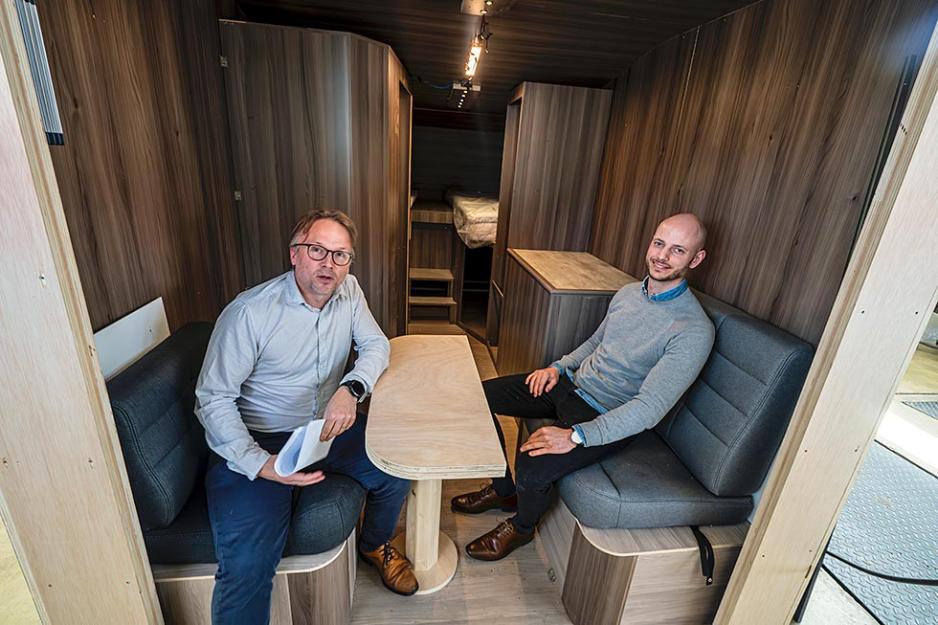 Så langt er det bare modellen med fransk hjørneseng som er ferdig og vises på høstens messer. Men man har utviklet en søskenmodell med høye enkeltsenger og garasje som kommer til våren. I påvente av den kan vi vise bilder fra fullskalamodellen av bodelen som ble bygget under utviklingen.