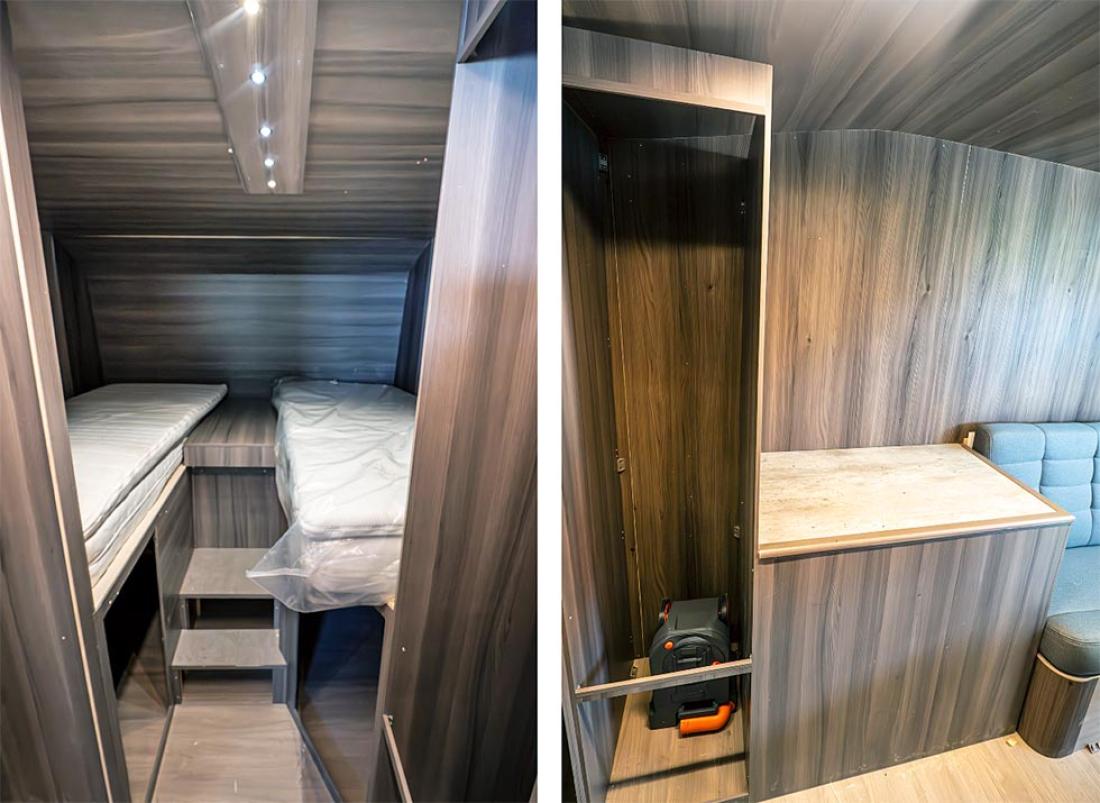 Når man skal bygge en smal bobil, er utfordringen å få bilen til å ikke føles trang. Nøkkelen til å løse dette er en sittegruppe med motstående sofaer. Det åpner opp bodelen en god del. Man valgte også at en av modellene skulle ha en hjørneseng, såkalt fransk seng. En soveromsløsning kjent for å skape romfølelse i bobiler. Den andre modellen har langsgående senger i soverommet, rett og slett fordi det er så populært. Om det blir flere planløsninger, kanskje med en queen-size seng, gjenstår å se.