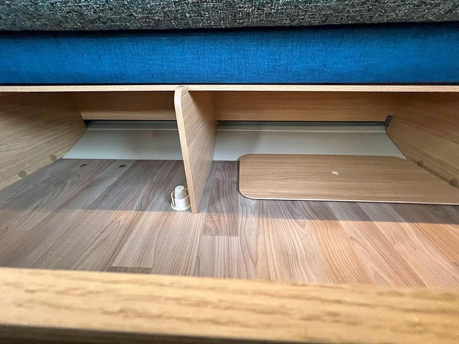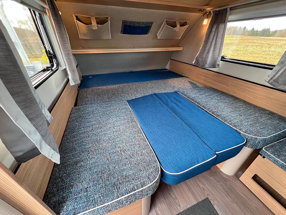 Ferdig oppredd er sengen stor, 175 x drøyt 200 cm. Ulempen er at soveflaten består av mange små madrassbiter. Derfor er en overmadrass å anbefale. Var denne vognen min, ville jeg anstrengt meg for å skaffe eller tilpasse én stor overmadrass på nøyaktige mål. To voksne har skikkelig god plass, vi testet ut med et barn også – noe som gikk veldig bra i den lille vogna.