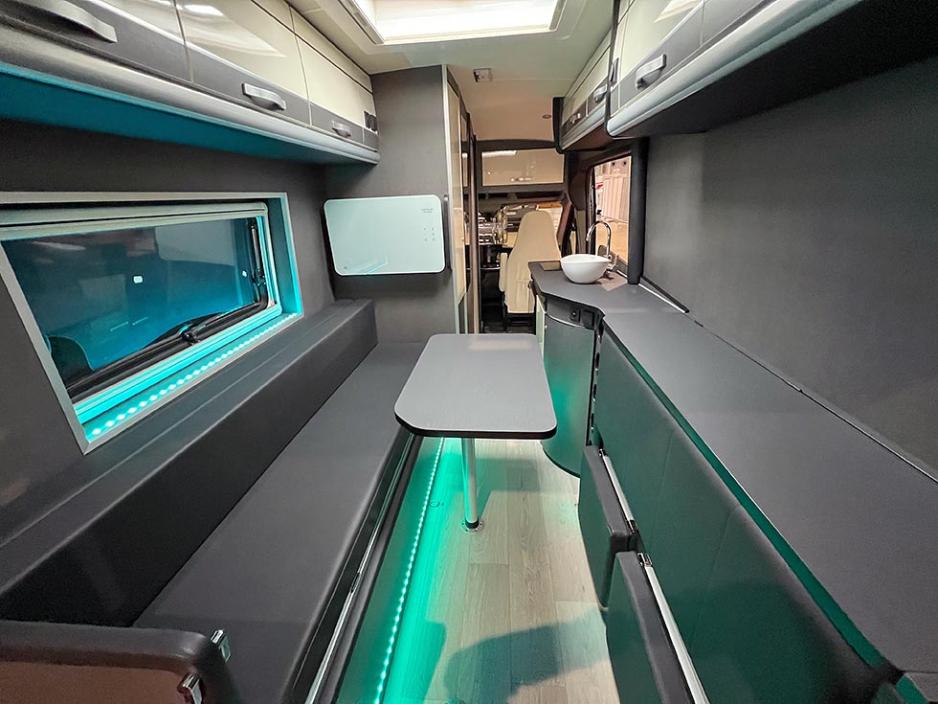 Vi så den nye elbybobilen i et hjørne på CMT-messen i Stuttgart i januar. Rekkevidden på denne er oppgitt til opp mot 317 km. Mer info finner du på: iridium-wohnmobile.de