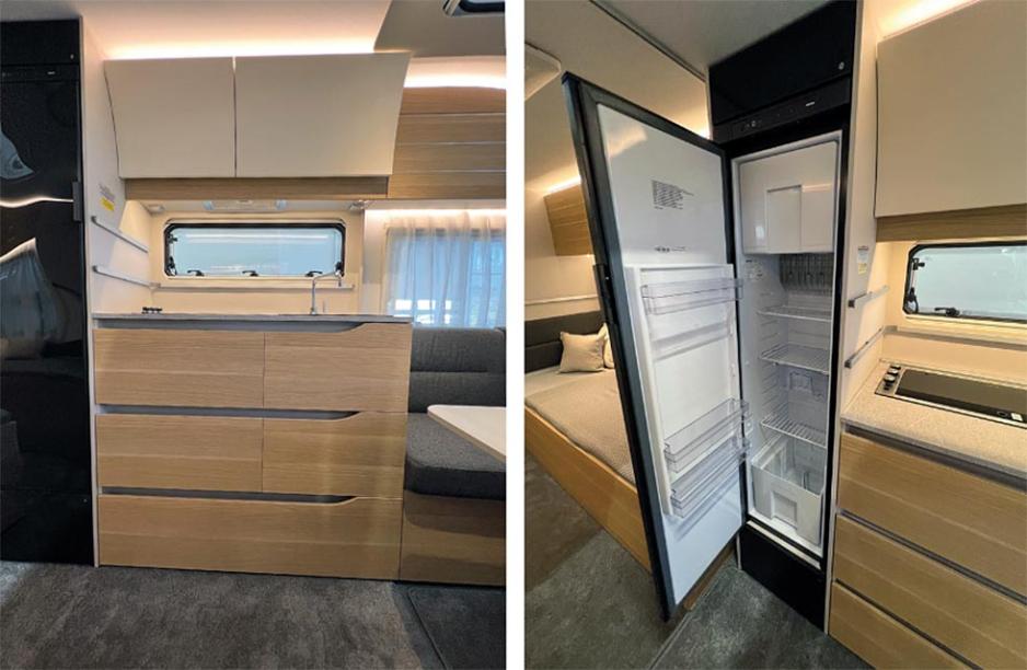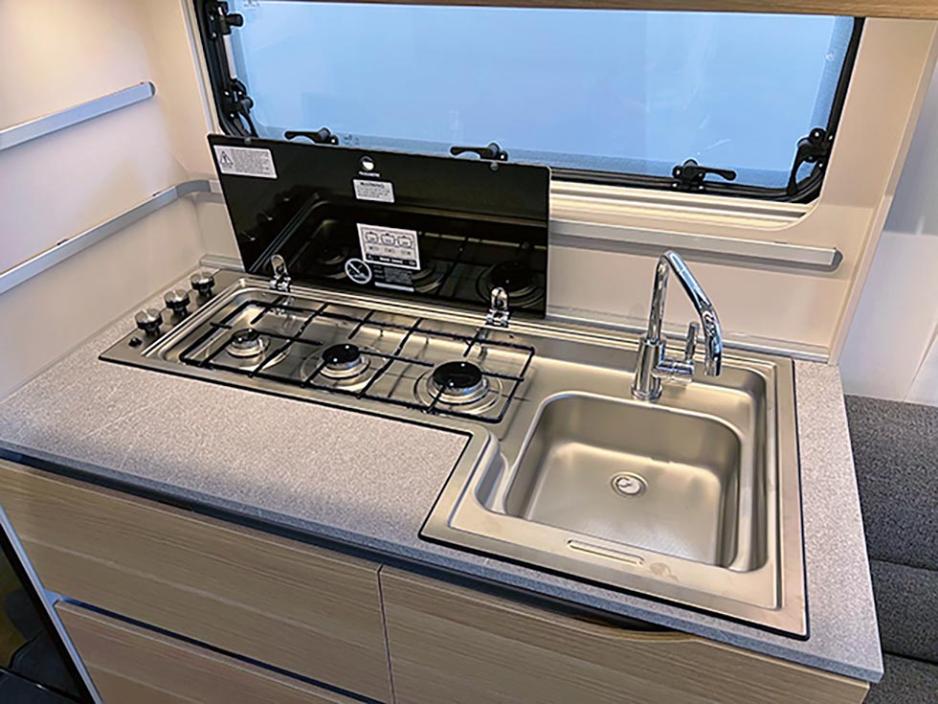 Jeg må også gi skryt for den kombinerte vasken og koketoppen, selv om tre bluss kanskje ikke er nødvendig for alle? Men, det er praktisk og lettvint å gjøre rent en koketopp med integrert vask. Det er en liten praktisk kjøkkenvifte i overskapet, og for å kompensere for relativt liten arbeidsflate er det en skjærefjøl over vasken og glasslokk over gassbrennerne. Kjøleskapet er fra Thetford og er til sammen på 142 liter, hvor 15 av de er fryser.