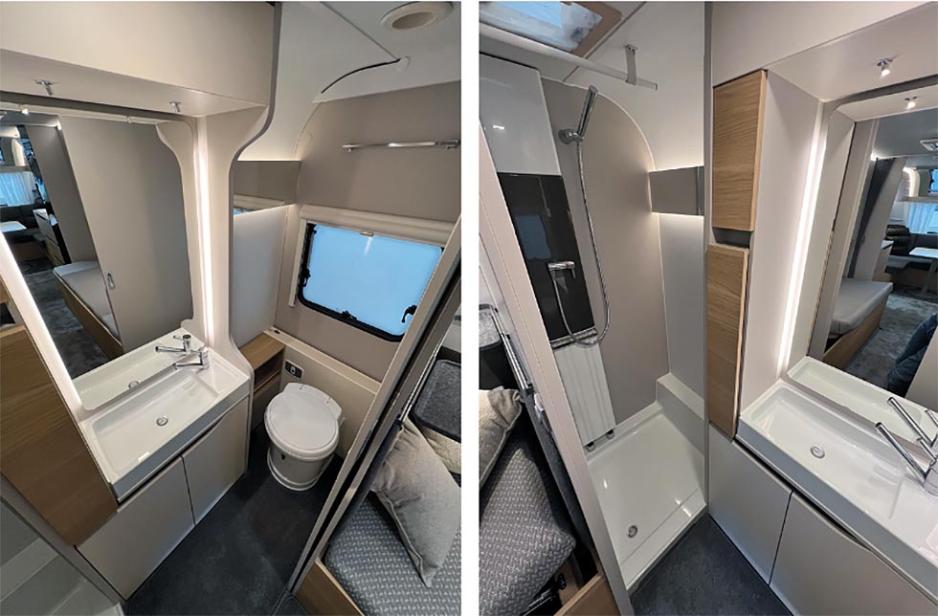 Badet er noe smalt når døra er igjen. 46 cm ved vasken er det trangeste stedet. Det romsligste stedet å kle på seg er faktisk i dusjen. Kanskje du skal gjøre som flere bobilprodusenter har gjort det: Lage en trerist du kan legge på gulvet etter dusjen? Uansett gir dette badet deg et godt utgangspunkt for å starte dagen på best mulig vis.