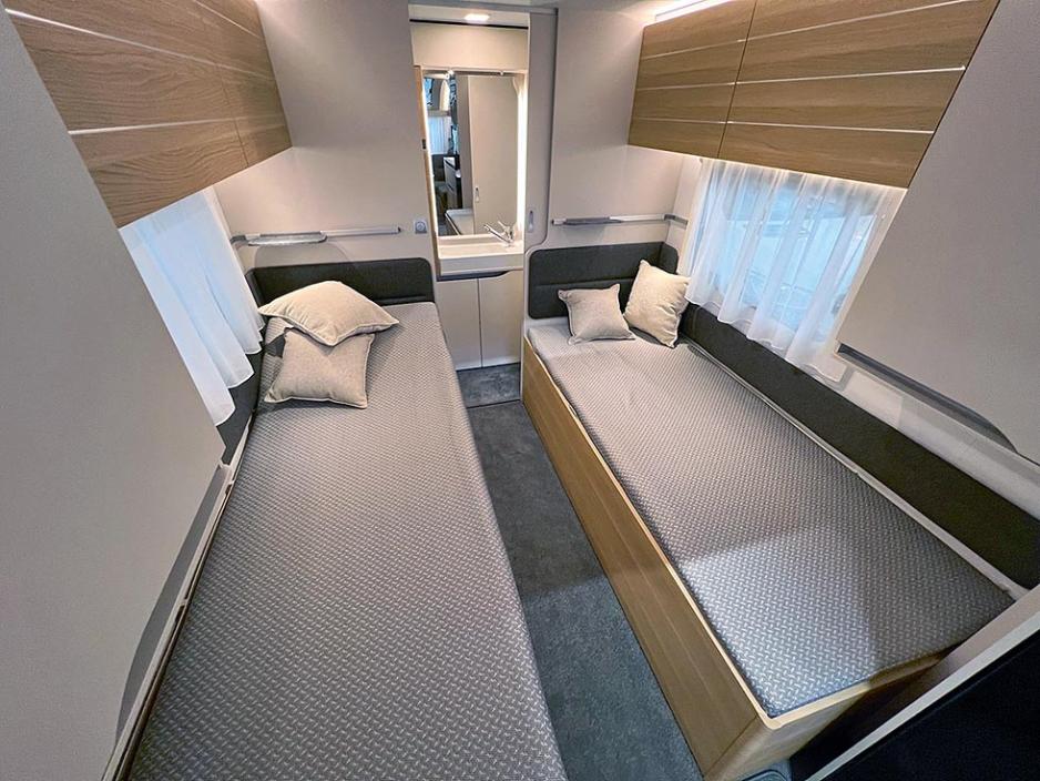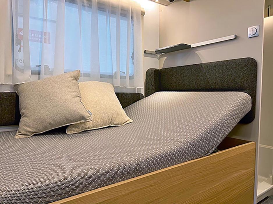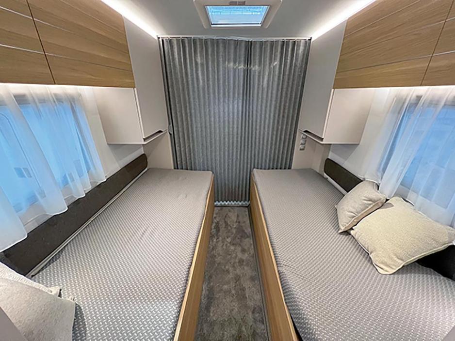 Dette er uten tvil en luksusvogn for to personer. Men den har soveplass til fire. For å re opp de to siste plassene senkes bordet, og putene i sittegruppen arrangeres til en dobbeltseng. Men det er de to enkeltsengene som byr på god sovekomfort. Tykke og relativt faste madrasser hviler på trespiler. Adria har lagt til en hevefunksjon for hodeenden på begge sengene. Det betyr at du kan få en litt mer oppreist stilling om du skal lese en god bok, for eksempel.