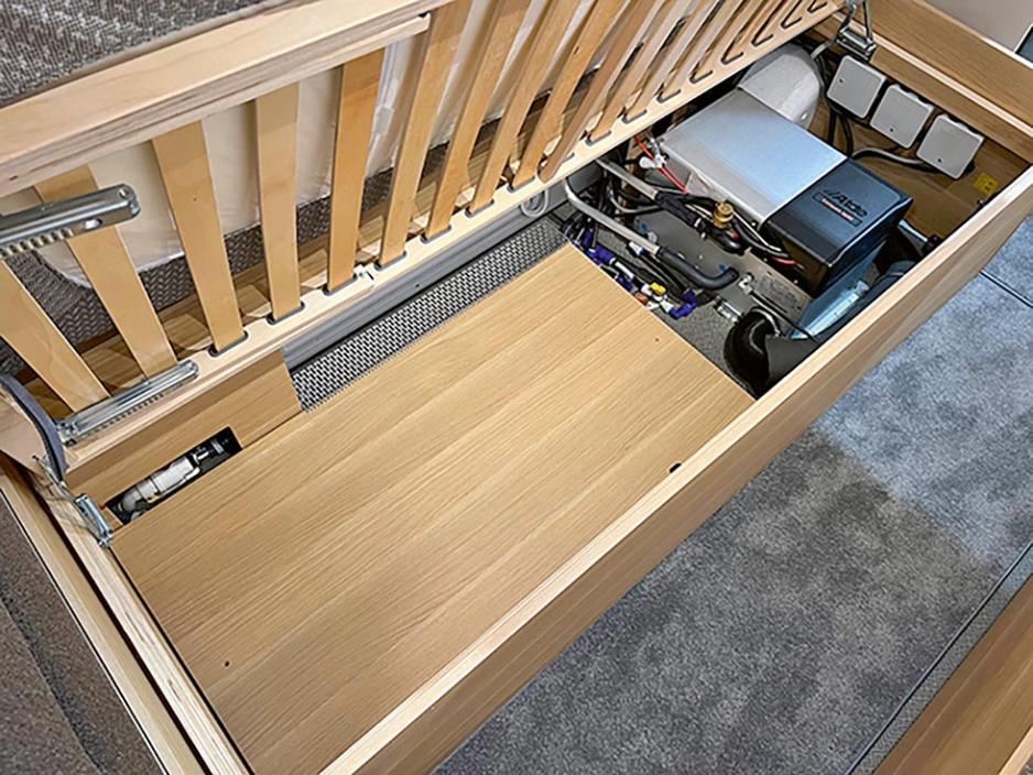 Den vannbårne varmeren Alde Compact 3030 er plassert under venstre seng. Likevel er det bra med lagringsplass her, og en utvendig luke for enkelt å kunne legge inn utebord og stoler. Under høyre seng er batteriet plassert og her er det enda mer lagringsplass. Begge sengene er hengslet på langsiden med gassdemping, noe som gjør det enkelt å komme til lagringsplassen.