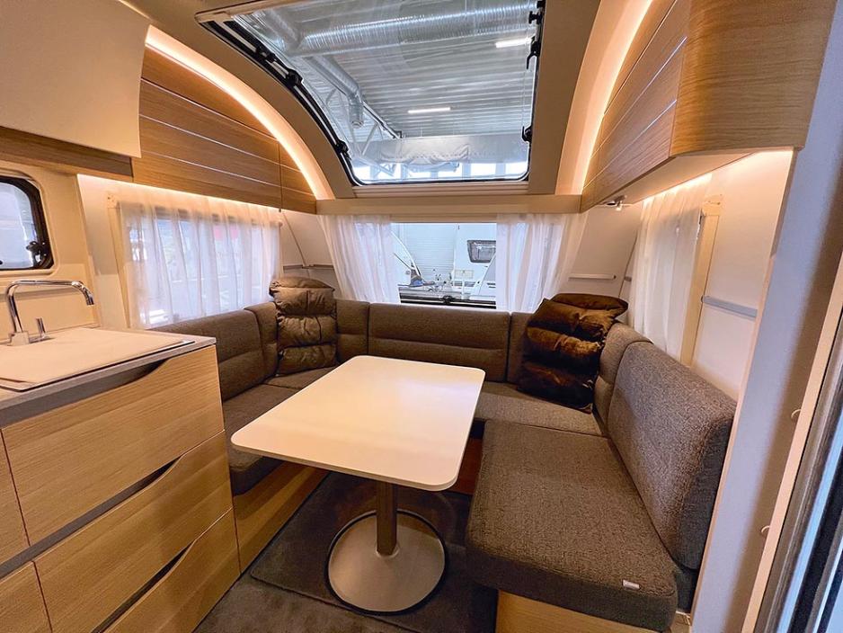 Denne vognløsningen er populær for tiden, og det er ingen tvil om at dette er en super utnyttelse av all den innvendige plassen du har i en campingvogn. Det er lett å sammenligne med en bobil, som i praksis aldri kan prioritere så stor plass til badet og samtidig ha en så åpen stue med samme yttermål.
