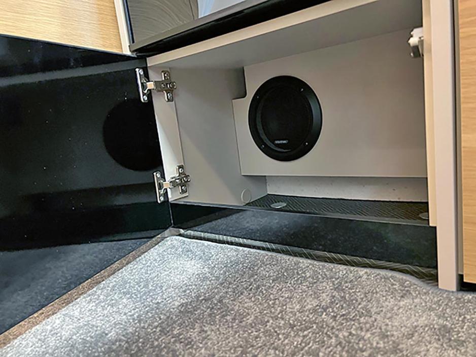 Adrias vogner har i flere år blitt levert med et lydanlegg hvor du kobler deg til med blåtann. Løsningen er enkel og fungerer superbra. Kanskje ikke for hifi-entusiaster, på grunn av lydkvaliteten – men mer enn bra nok til å høre på radio eller ha litt musikk i bakgrunnen. At Adria i denne modellen har valgt å plassere to høyttalere under sengen mot baderomsveggen (uten hull i veggen) og en høyttaler i skapet under kjøleskapet er litt merkelig prioritering. Lyden blir generelt ullen, selv om den er ganske bra på badet. Men det er vel ikke først og fremst der du vil ha musikk? Vel, ønsker du bedre lyd er dette uansett relativt enkelt å oppgradere.