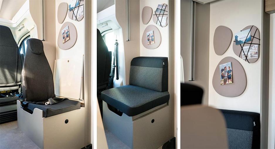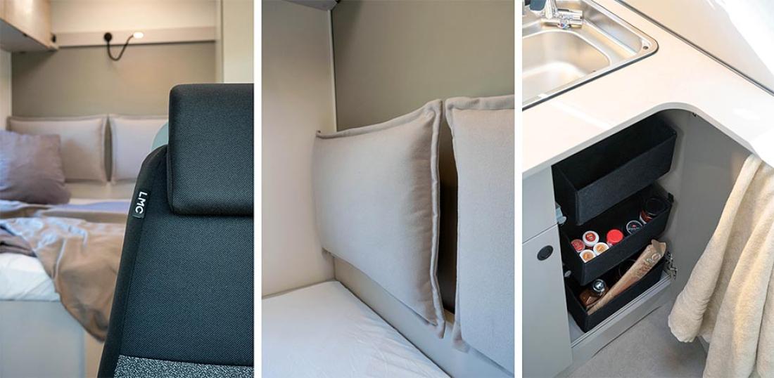 Den romslige takhøyden i sengeområdet gir mulighet for å feste to store puter på bakveggen med et hurtigfeste av typen Fidlocks. Det gjør det enklere og mer naturlig å bruke sengen også på dagtid, som en slags sofa. Putene kan du selvsagt også bruke i sittegruppen.