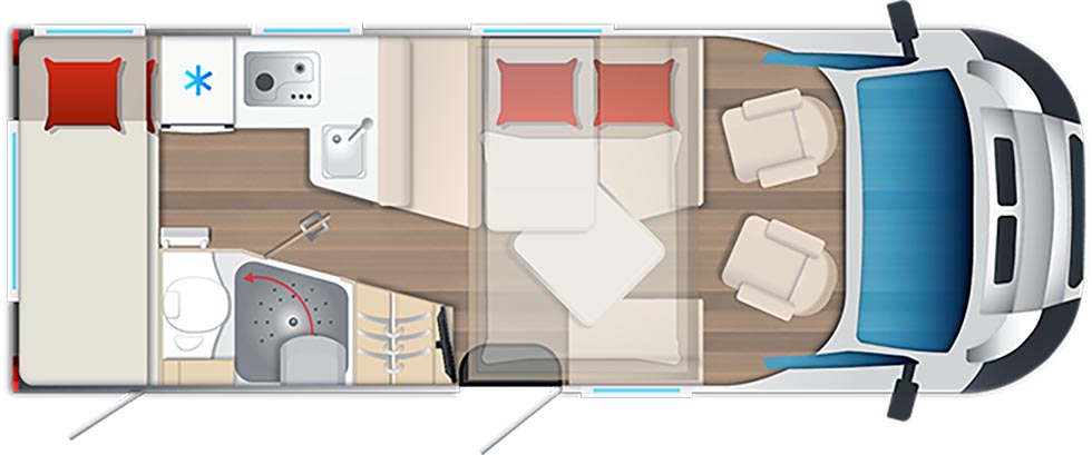 Som standard leveres Campeo TD med isolert dobbeltgulv, noe som bidrar til å gjøre serien egnet til helårsbruk. Campeo TD-serien byr på fem smarte, kompakte planløsninger med opptil seks sitteplasser og sju sengeplasser
