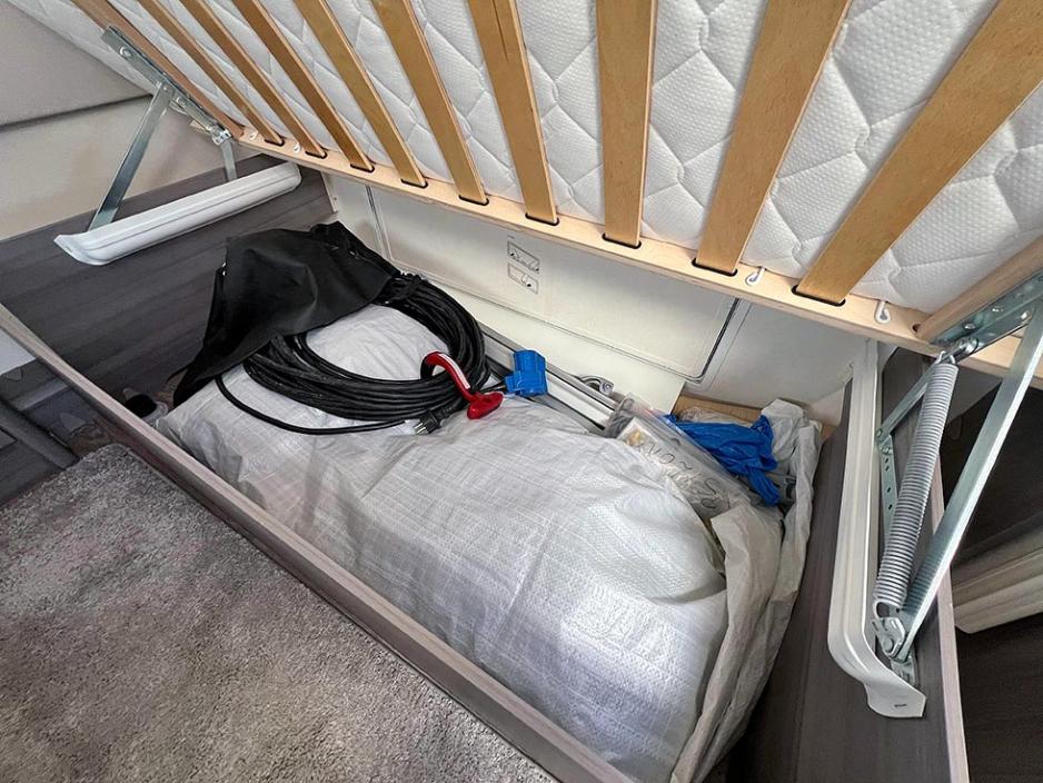 Begge sengene kan vippes opp, og her er det mye lagringsplass. Her er det også mulig å hive inn stoler og bord utenfra. Ellers har du alt du trenger, fungerende bad, kjøkken, varmt- og kaldtvann, Truma Ultraheat varmeapparat. Det er også kjøkkenvifte på 12V, gulvtepper, elektrisk gulvvarme og myggnetting til både vinduer og dør.