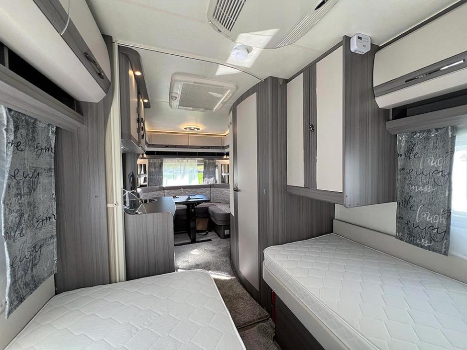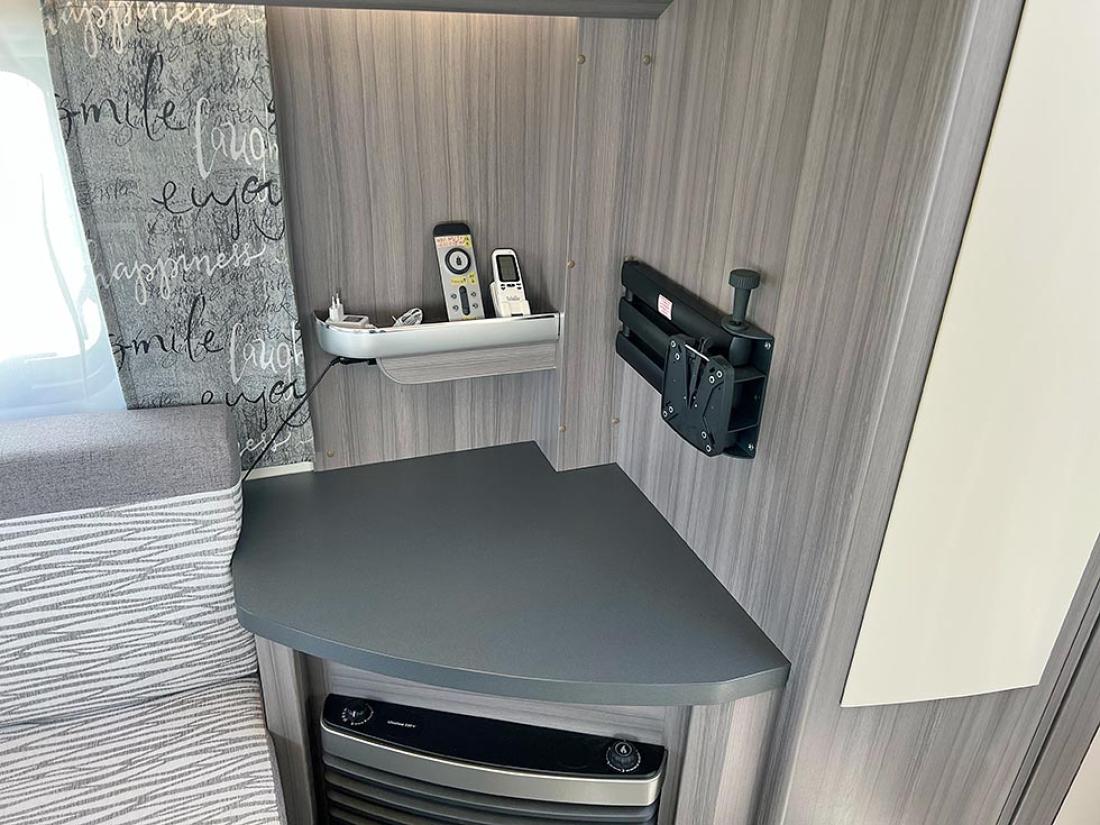 Nettopp denne vognen har en god del ekstrautstyr, som gjør at dette må være et godt kjøp. Eller hva sier du til: Takmontert aircondition, sykkelstativ på draget og Truma Mover. I tillegg har vogna utvendig posemarkise med sidevegger. Vogna selges med gassflaske inkludert.