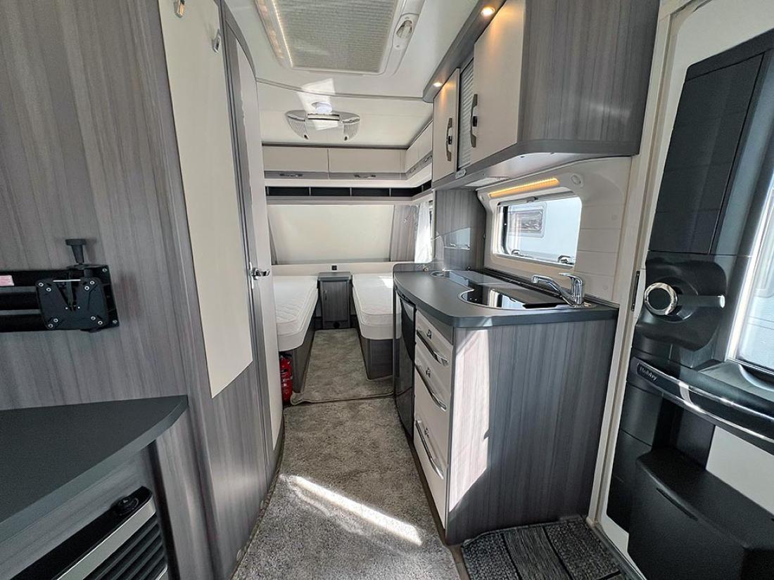 Hobby 470 UL OnTour er en perfekt reisevogn for to personer. Med to enkeltsenger, stilig interiør og relativt lav vekt er den perfekt å ha med langs veien. Jeg har plassert meg i sittegruppen når jeg skriver dette, og her er det lyst og fint. Det skyldes flere ting. Som interiørfargene, vinduene, og ikke minst selve lyssettingen. Det er indirekte lys i hjørnene og over overskapene, og det er leselys i hjørnene på u-sofaen. Midt i vogna er det kjøkken med motstående bad, og så de to enkeltsengene. Det er mange lyse farger, i kontrast til en mørkere trefarge på møblene.