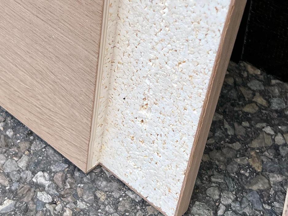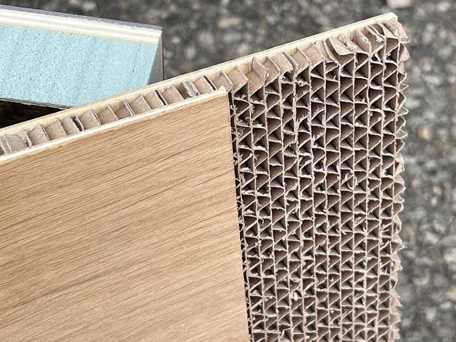 Fornybare råmaterialer brukes også i bordet og kjøkkenbenken. Her benyttes en kjerne av såkalte popcornpaneler, utviklet fra mais kledd i oljet eikefiner. Panelene har samme mekaniske egenskaper som kryssfiner, men bare halvparten av vekten.