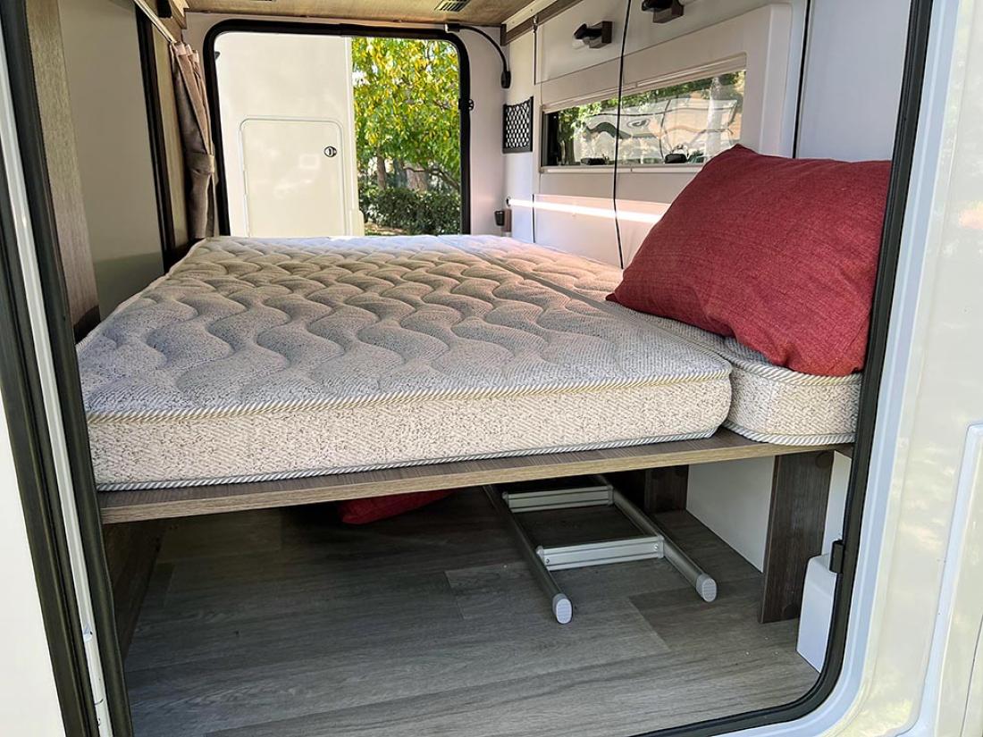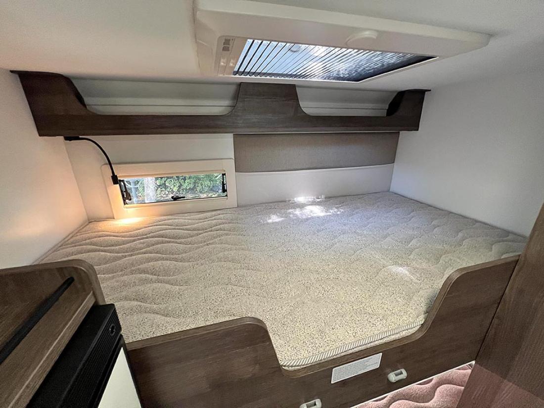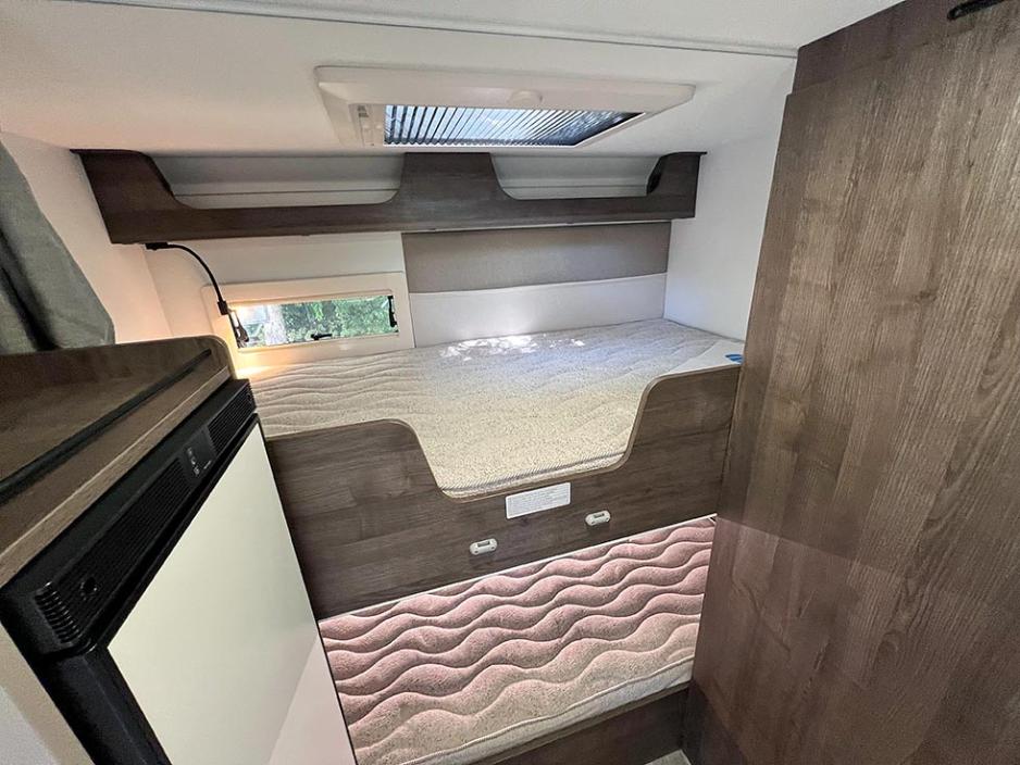 Hovedsengen er en senkeseng over sittegruppen. Bakerst finner du en utradisjonell køyeseng, i den forstand at den er bred. Så bred at to barn får plass her.