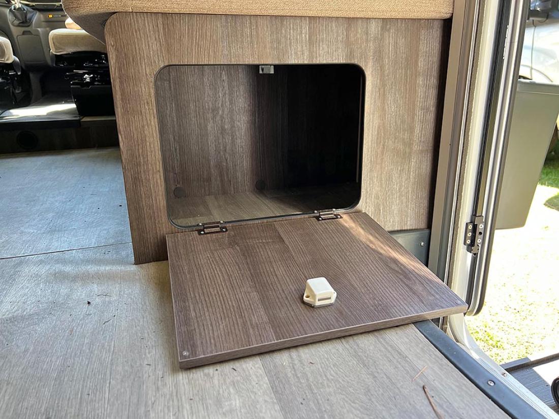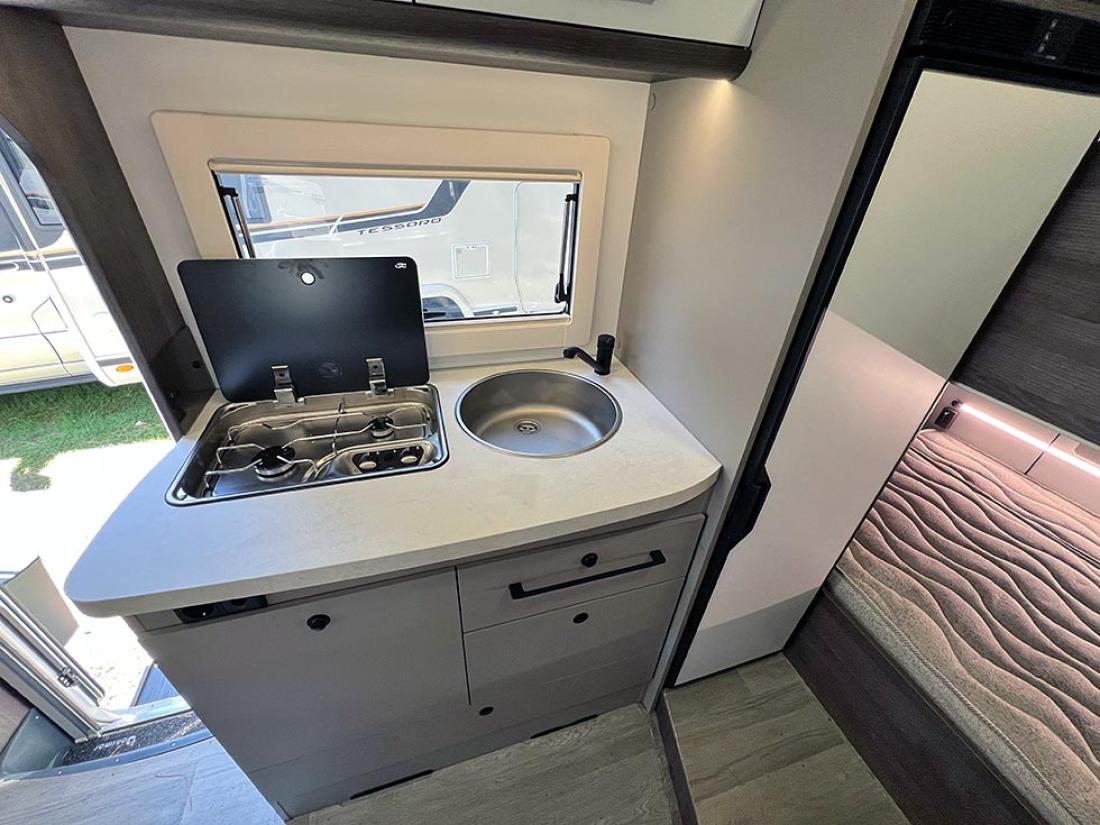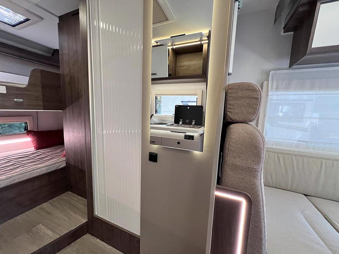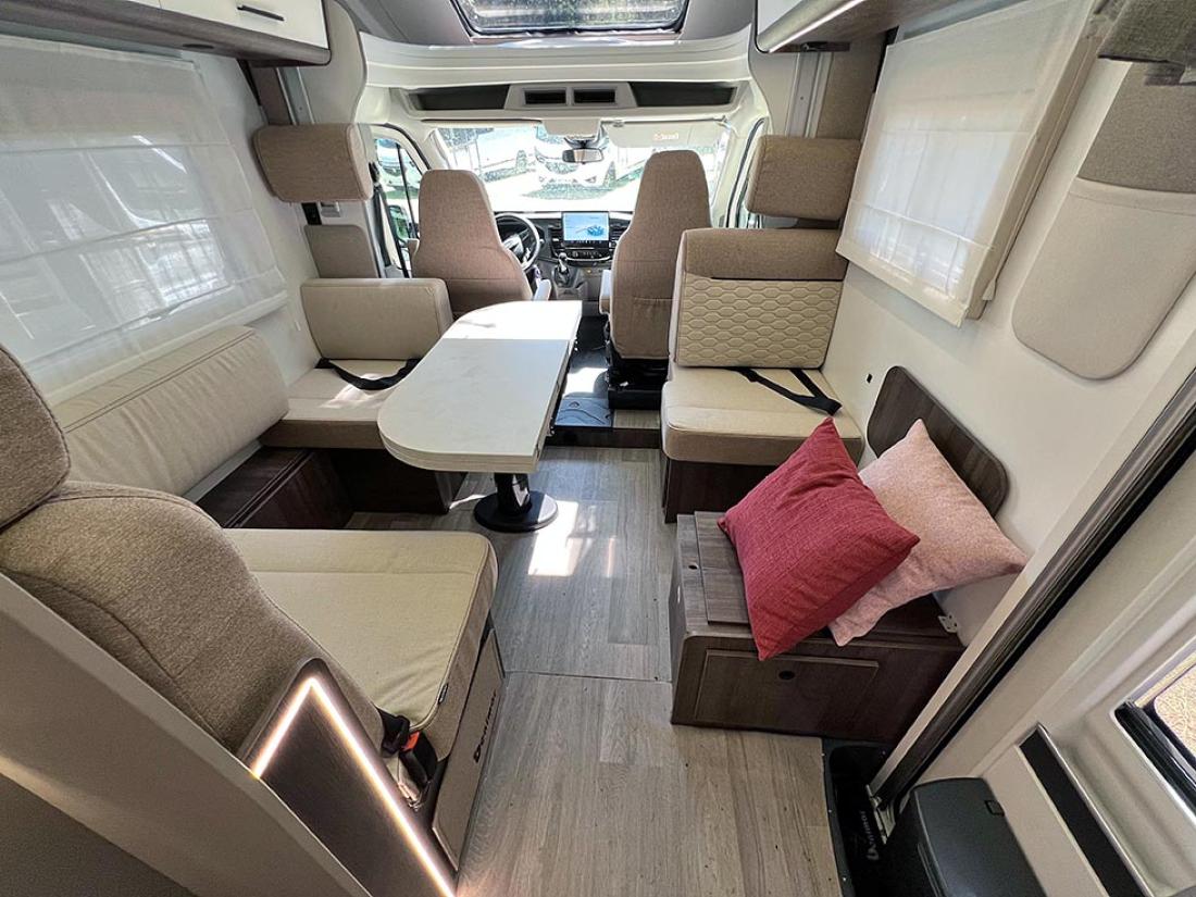 Kortsiden på venstre L-sofa er et klassisk utformet baksete, med plass til to personer med tre-punkts sikkerhetsbelte. På prototypen vi testet ut hadde begge de langsgående sofaene muligheten for å bygge hver sin bakovervendte sitteplass. Med to forseter vil da bobilen kunne romme seks personer. Men, her trer lovverket inn og setter begrensinger, noe som betyr at i Norge vil bobilen «kun» komme med fem sitteplasser.