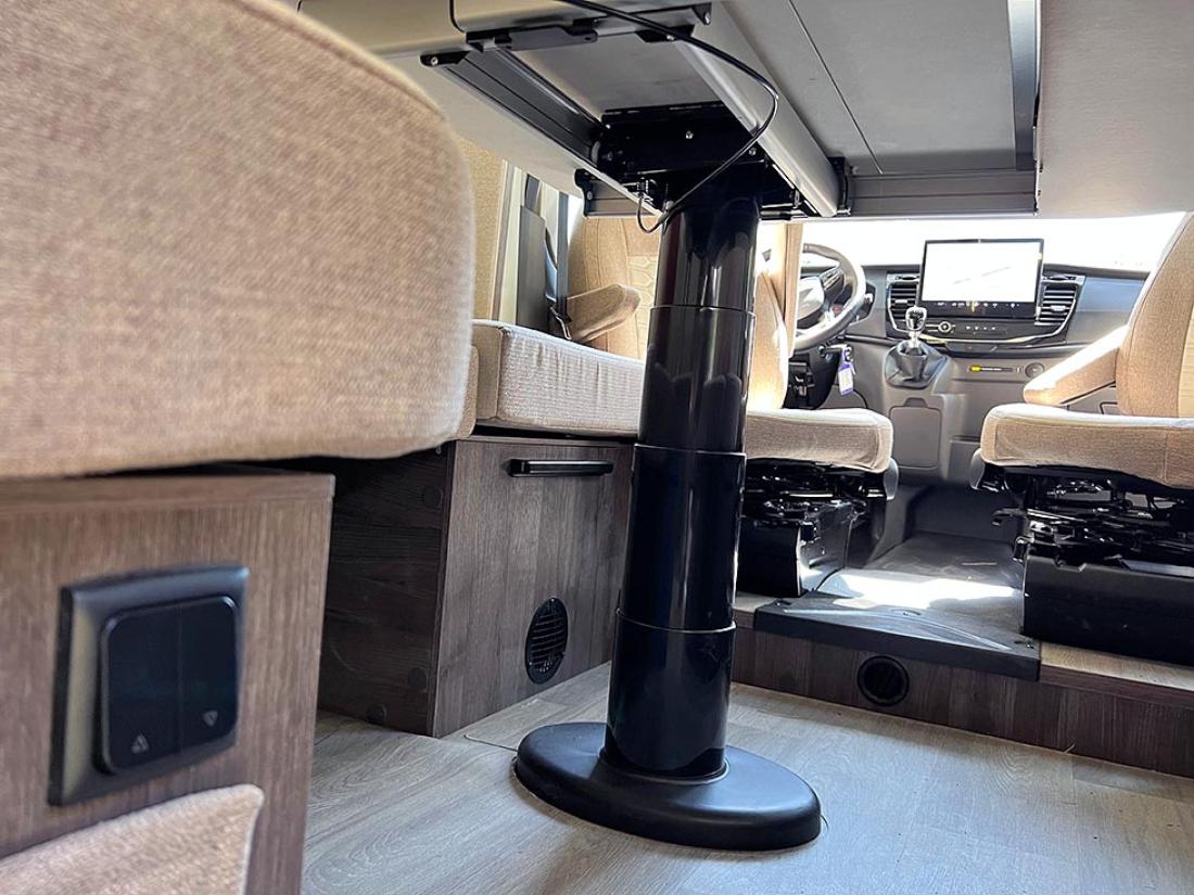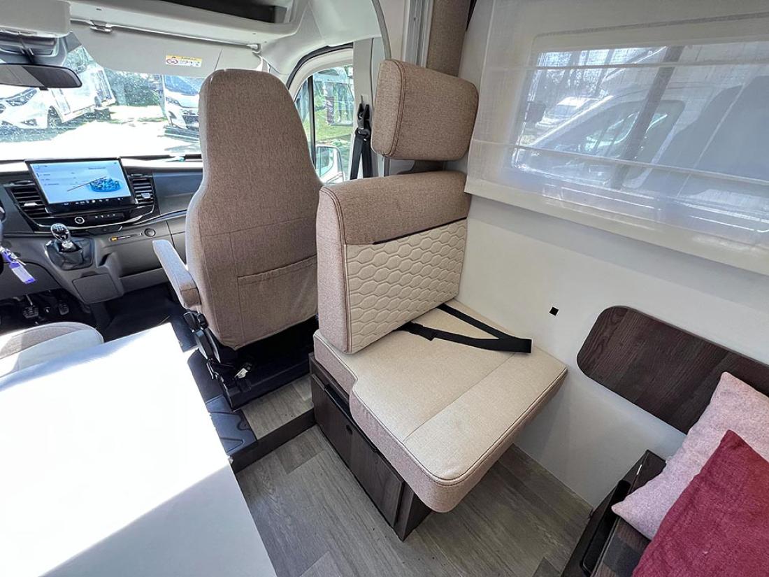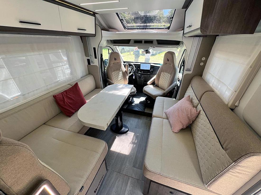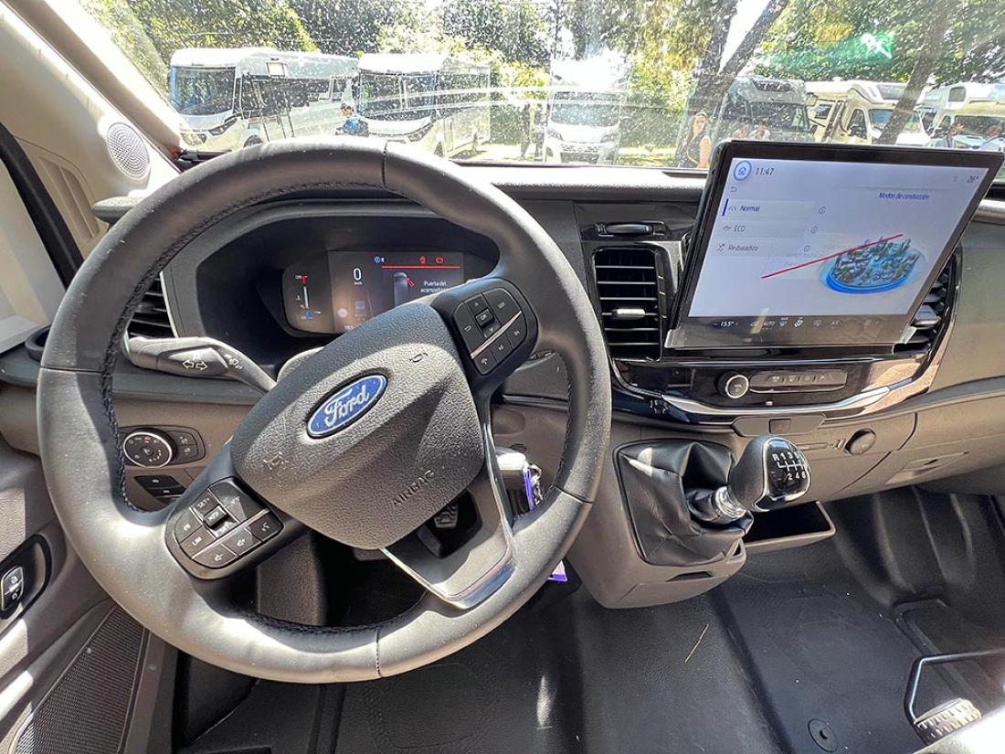 Benimar har i mange år vært glad i å bruke Ford Transit som basisbil, det gjelder også den nye 425-modellen. Ford gir stor kjøreglede på veien, men førerhuset er noe trangere enn på Fiat Ducato. Det merker du best når du har parkert og skal snu seter og bevege deg rundt innendørs.