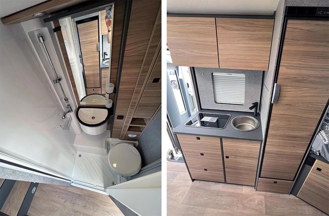 Kjøkkenet har det du trenger, men heller ikke mer. Det betyr begrenset arbeidsflate, men kokebluss og vask, selvsagt. Vinduet på kjøkkenet har en fin innramming, det er ingen gardiner på noen av vinduene. Baksetet er tradisjonelt utformet, med plass til to. Crafter er såpass smal at det ikke er noen sidesitter.