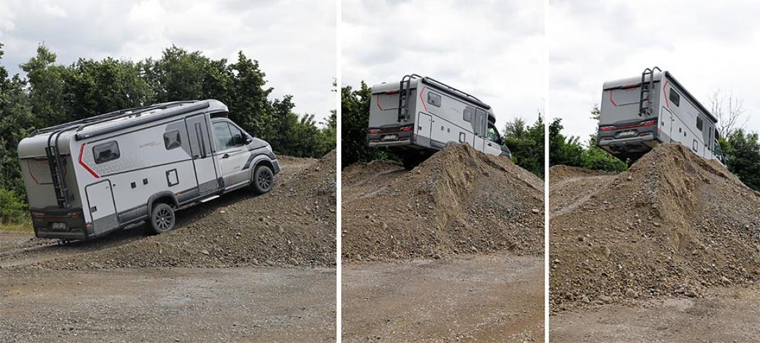 Og krabbet over, det gjorde Globebus Performance 4x4. I tillegg kjørte den over en humpete vei med hjulløft for annenhver meter. Det ser imponerende ut, selv om alle bakker og vinkler i den spesialbygde hinderløypa nok var tilpasset nøyaktig hva bobilen kan klare.