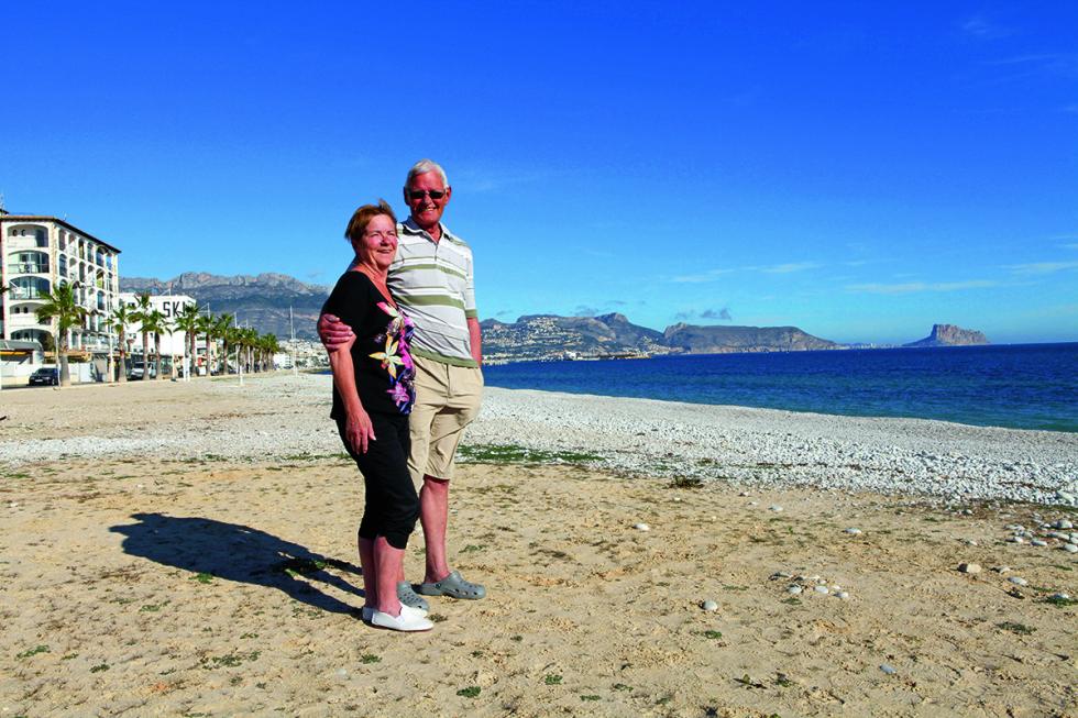Bjørg og Rudolf nyter livet på Playa Cap-Blanch med 20 varmegrader i desember.