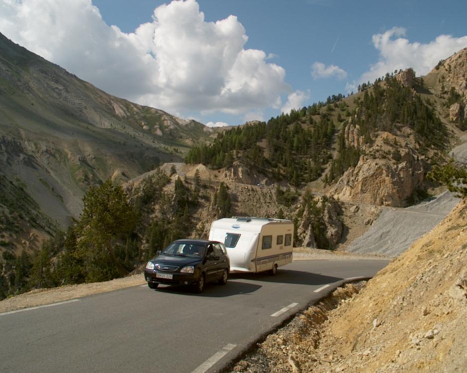 Ved foten av Alpene stiger pulsen, for vi er ikke sikre på om vi vil klare å få campingvognen med over alle fjellpassene. Vi forhører oss over alt, men tilbakemeldingene fra franskmennene er veldig forskjellige. De stedene, der vi fortsatt er i tvil, kjører vi først opp på fjellet uten campingvogn, for å se ann terrenget. Mange steder får vi bekreftelse på, at det ikke er noe sted man trekker med seg en campingvogn. Heller ikke selv om det kan la seg gjøre. Og denne turen dreier seg heller ikke om å slå rekorder eller framskaffe avisoverskrifter.