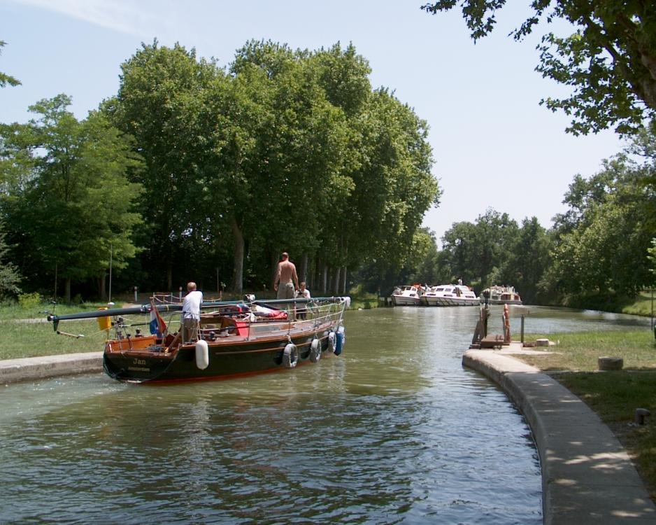 Vi har så langt det er mulig unngått å kjøre inn i de store byene. Ikke fordi det ikke er noe å se på, men fordi vi har med campingvognen hele tiden, og det er ikke mulig å få parkert. Selv i halvstore byer har vi vært nære på å lage trafikkaos. Det er ikke noe særlig moro. Forståelig nok blir man enormt upopulær blant andre bilister. Rett sør for Toulouse tar vi den første pausen. Canal du Midi som forbinder Atlanterhavet med Middelhavet går her. Et selvsagt sted for lunch.