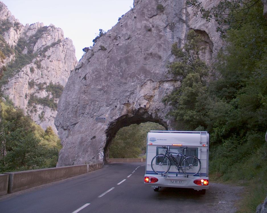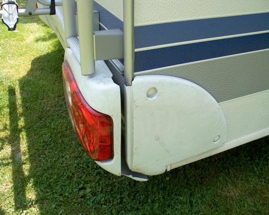 Det er også et problem når det kommer møtende trafikk, som skal passere. Det er med "tungen rett i munnen" at jeg må kjøre helt ut på den ene kanten og utnytte hver centimeter for å slippe motgående forbi. I Mirepoix går det galt. Jeg lykkes med å presse meg så langt ut på siden at den møtende kunne komme forbi, men da jeg skulle videre måtte jeg svinge en aning for å komme forbi et tre, noe som resulterte i at bakenden på campingvognen svingte ut og traff et tre. Det var heldigvis bare litte grann, men bakkjermen fikk en skramme og lyktekonsollen på høyre side løsnet. Det er den helt klassiske feilen når man sviner med vogntoget. Heldigvis virker lysene og alle ledninger er intakte, så vi fikser det med tape.