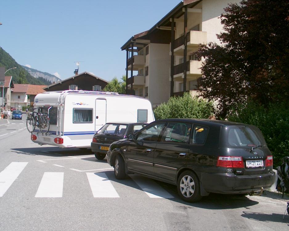 Vi kommer greit ned fra fjellet og fortsetter ned gjennom Col du Lautaret og La Grave, før vi kommer til Le Bourg-d´Oisans, som ligger ved foten av Alpe d´Huez. Vi finner først campingplassen vår og jeg spør campingverten, om han mener at det er mulig å kjøre opp på toppen av Alpe d´Huez med campingvogn. Han rister energisk på hodet og sier, at det synes han under ingen omstendigheter, at vi skal. Vi bestemmer oss for å la campingvognen stå på campingplassen og kjører opp i bil. Det dreier seg om 19 km stigning, og når det er gått bra over Col du Galibier, så det er det ingen grunn til sure miner. I virkeligheten er det nedkjøringen jeg er mest bekymret for, nå som bilen har vist, hva den kan, er det ikke den, som er begrensningen, men til gjengjeld de 19 km ned fra et bratt fjell, som vil være en enorm belastning på campingvognen. Vi kjører opp uten campingvogn.