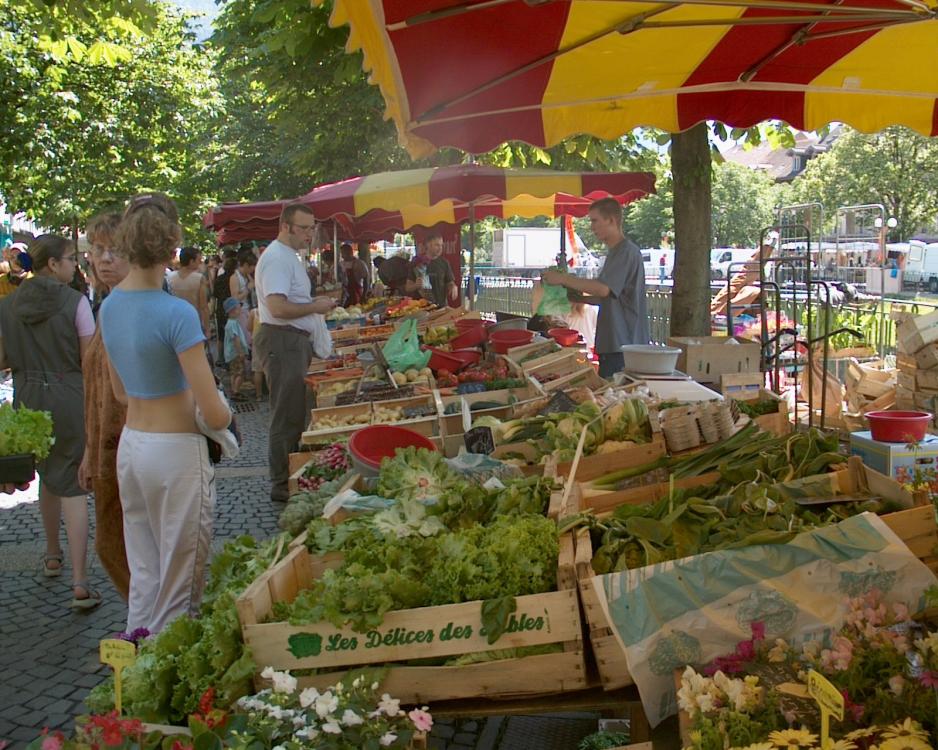 Vi forlater campingplassen og kjører ned i dalen igjen for å komme til Sallanches, der dagens etappe starter. Det er kaos i den lille byen for hele torget i sentrum er et overveldende marked. Der må vi selvfølgelig inn. Elven deler markedet, slik at det er spiselige ting på den ene siden og ikke spiselige på den andre. Vi kjører rundt og rundt for å finne en parkeringsplass, men siden jeg kan se, at et utall franskmenn allerede har foretatt sine fantasifulle parkeringer, er jeg klar over at det blir en vanskelig oppgave.
