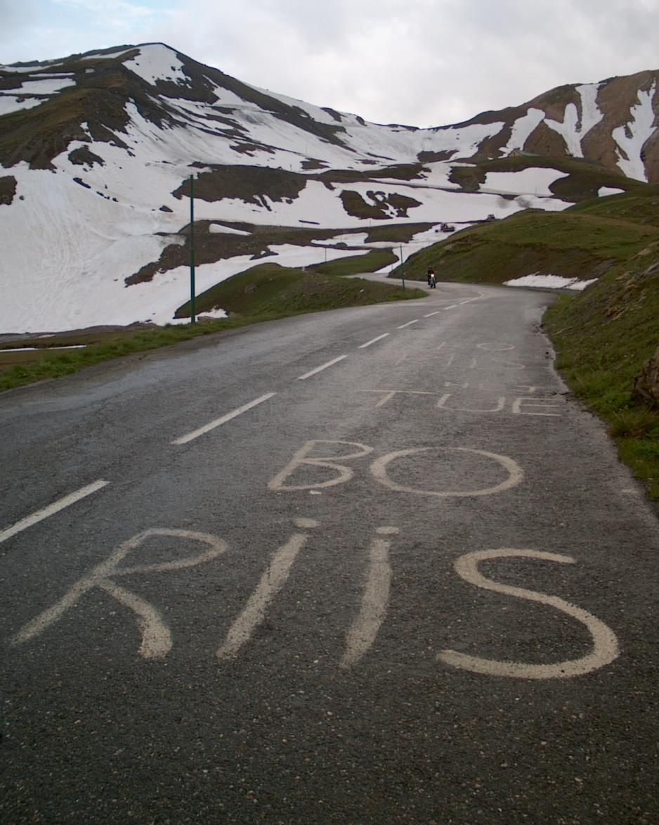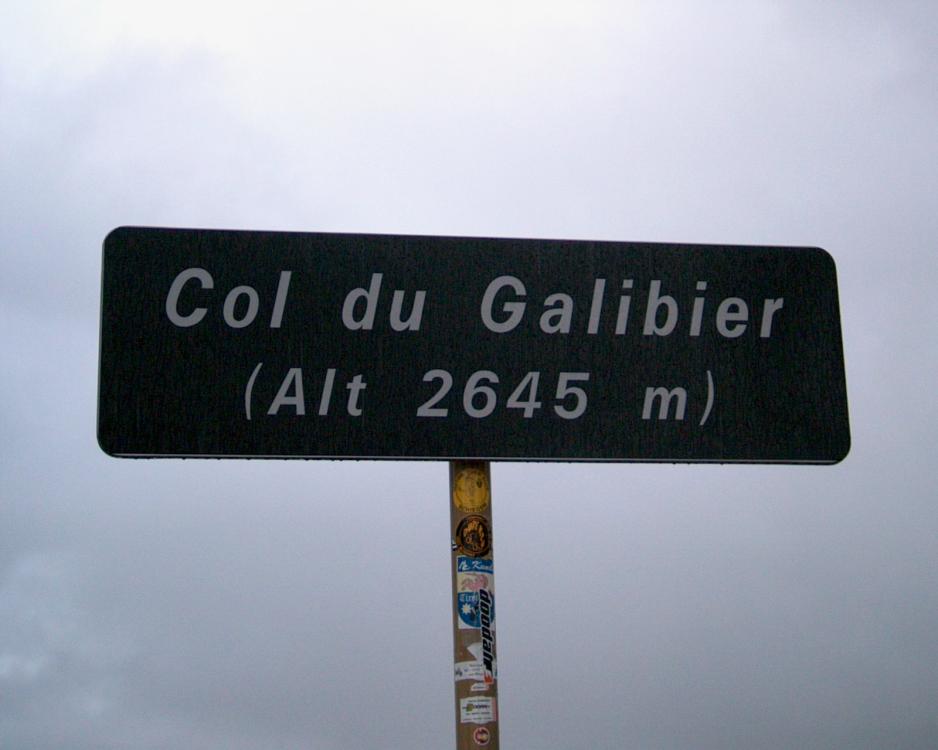 Efter Valloire kommer det en langstrakt fjellvei med ganske få stigninger. Her skifter været og det begynner å styrtregne. Spørsmålet er om sikten på toppen av Col du Galibier er særlig god. Vi kjører stille og rolig videre, og tar tingene som de kommer. 3-4 km før toppen begynner det for alvor å stige. Vi ser de kjente sykkelrytternes navn malt av entusiastiske tilskuere med bred hvit maling på veien. To av våre egne har også vært her. Riis og Hamburger. Det er ganske enkelt for bratt.