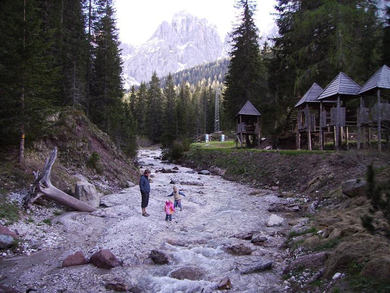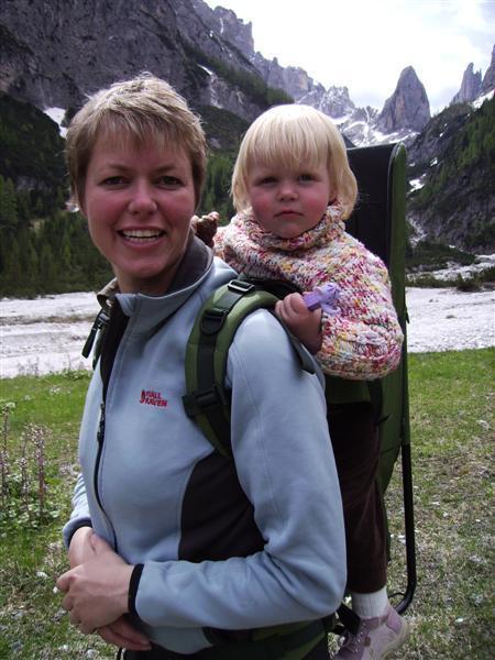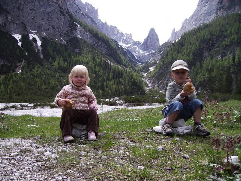 Campingplassen Caravanpark Sexten ligger ved foten av Dolomittene og Alpene på samme tid. Det er veldig stor forskjell på de to fjellkjedene og det gir en fantastisk beliggenhet, som på kjøpet er på 1500 meters høyde. Plassen er lett å kjøre til. Det er bare en relativt bratt stigning de siste 2 km. Vi har pakket ryggsekkene og begir oss ut på fottur i de imponerende omgivelsene. Parco Naturale Dolomiti di Sesto er den nasjonalparken, som ligger noen få km fra plassen. Et rent eldorado for fotturer - også for nybegynnere eller utrente. Det passer også bra for oss, fordi barna er med. Mie (1½ år) har jeg i en bærestol på ryggen, noe som innebærer ca. 20 kg ekstra og tilsvarer en fullpakket ryggsekk. Mathias (4 år) går selv og er flink til det, men det er jo grenser.