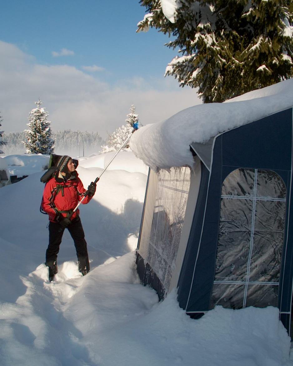 Forteltet er etter min mening ganske uunnværlig på en vintercampingtur av lengere varighet. For det første er det en enorm varmesluse, slik at varmen i campingvognen ikke forsvinner hver gang noen åpner døren. Det er også et praktisk oppbevaringsrom for ski og støvler, som ellers tar stor plass i skapene i campingvognen. Sydpå vil jeg ikke råde deg til å sette skiene utenfor campingvognen, som man ser så mange gjør oppe på fjellet. Hvis vi er mange i vognen henger vi også ofte skitøyet i forteltet, og unngår dermed en masse kondens inne. Campingvognen, LMC 580 K, har sentralvarme og dobbel bunn i alle benker samt vinterrygglener, som gir en god sirkulasjon rundt hele vognen.