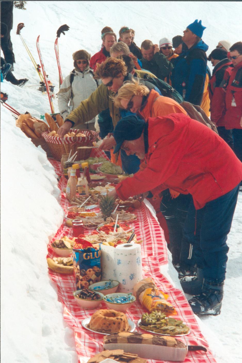 Flere ganger i uken kan man melde seg på en frokost i det fri. Det skulle vi prøve. Det koster ca. 75 kr. pr. voksen. Ved påmeldingen fikk vi utlevert et detaljert løypekart, som viste oss nøyaktig der vi kunne finne et bugnende bord midt i naturen. Vi finner det uten problemer og hvilken farveorgie av skinker, pølser, ost, brød, frukt, snacks og drikkevarer, som møter oss. Vi smører oss en kjempemessig sandwich, som vi nesten ikke kan gape over. Endelig sitter vi der på snøbenken og nyter den beste frokost med utsikt mot det imponerende Sella-massivet, som reiser seg loddrett 1.000 meter opp av fjellet. De lyse klippeveggene står bra til snøen og den dype blå himmelen. Etter frokost er det sledesafari for de som fortsatt kan bevege seg. Jeg har simpelthen for mye mat i maven til å kunne reise meg….
