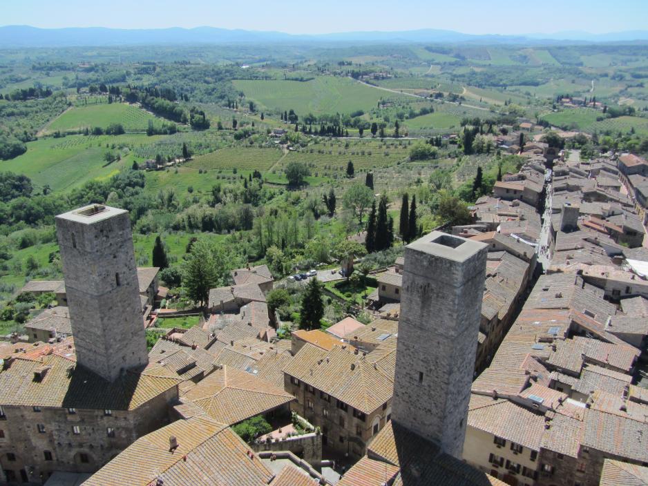 Det er tretten høye tårn, som har gjort San Gimignano så kjent som byen er i dag. Byens adelige familier bygde, på 1100 og 1200 tallet, de mange tårnene, så pilegrimer på vei til Roma kunne finne fram til byen. Den er ikke så veldig stor og man kommer best rundt til fots. Når man går i de smale steingatene kan man ikke se tårnene – det kan man først når man kommer opp på de forskjellige utsiktspunktene eller helt opp i det store tårnet Torre Grossa. Her fornemmer man det særpregede utseendet, som har gjort byen kjent.