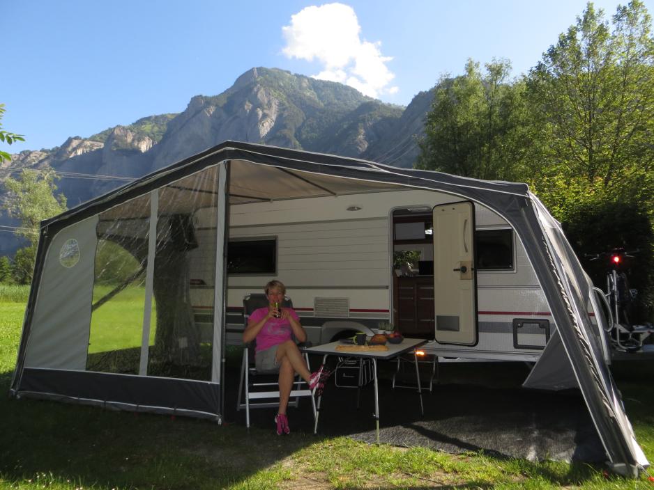 Campingvognen er plassert på en av de kanskje aller beste utsiktspunkter i Alpene – og det er mange, men her er det fjell på tre sider og det ene fjellet er det verdenskjente Tour de France fjellet Alpe d´Huez.
