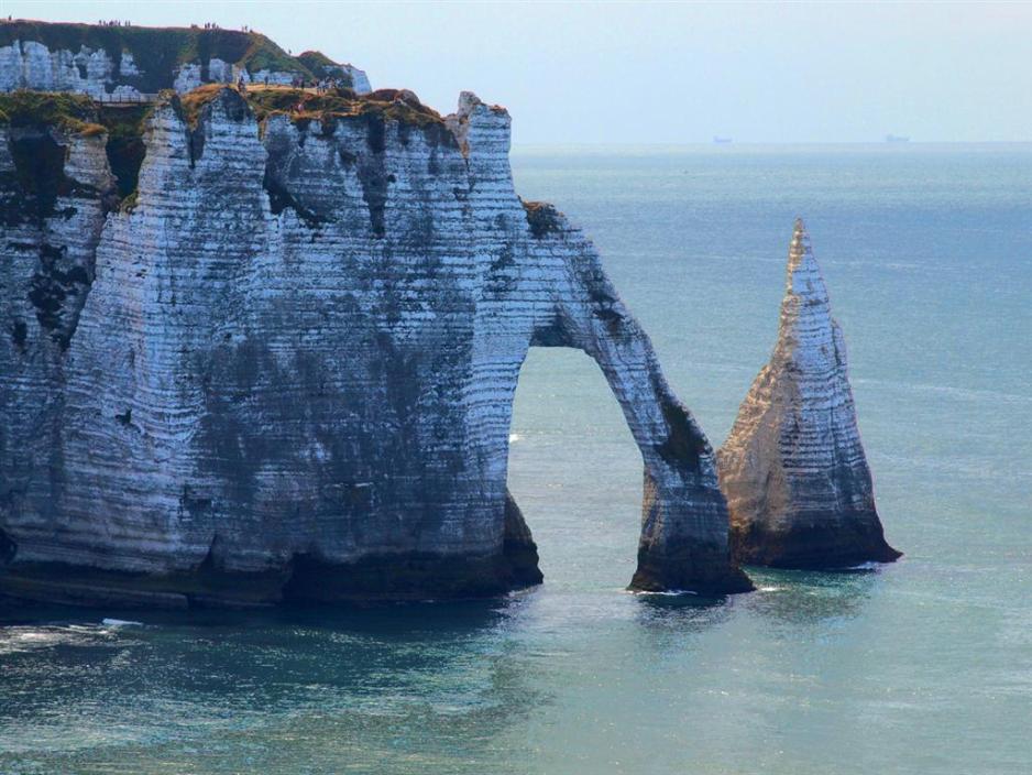 Det er en av de helt store trekkplastre for naturens skuespill, som finner sted her i den lille kystbyen Etretat. Kritt- og sandstensklippene hever seg bratt opp fra havet, som delvis har brutt dem ned. De harde partiene står igjen som festningsmurer og et enkelt sted står det en port ut mot havet. Det er en av de mest fotograferte stedene i Normandie, ja i hele Frankrike. Man må parkere i byens utkant, for det er ganske enkelt ikke plass nok til alle bilene, som gjerne vil se den spektakulære utsikten. Derfra er det ca. 1000 m å gå til stranden og klippene. Det er en lang og flott promenade, som følger hele bukten, men man kan på den sydlige delen av bukten bestige klippene med den gjennombrutte porten. Nord for bukten går en bratt sti opp over jordene ved de bratte klippene, hvorfra man også har en flott utsikt. Stien er oppmerket, men ikke spesielt jevn. Helt oppe på det høyeste punktet ligger en liten kirke Chapelle Notre-Dame-de-la-Garde, nærmest et lite valfartssted. Det er parkeringsplass bak kirken.