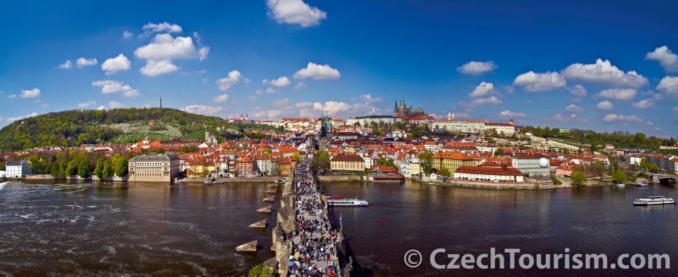 Byens hjerte er Karlsbroen. Herfra går alle veiene til bydelene øst og vest for elven. Mange mener det beste tidspunktet for å oppleve broen er når dagslyset bryter frem. Karlsbroen som går over elven Vltava, er den mest kjente broen i sentrum. Den nåværende broen sto ferdig på begynnelsen av det 15. århundret, og fram til midten av det 19. århundret var broen den viktigste forbindelsen mellom slottet på vestsiden av elven og Stare Mesto (Den gamle by) på østsiden. Opprinnelig var broens navn Stenbroen eller Prahabroen, men den fikk sitt nåværende navn i 1870, oppkalt etter grunnleggeren Karl 4. Karlsbroen er 516 meter lang og nesten ti meter bred. Den har 16 hvelvinger og beskyttes av tre tårn, to på vestsiden og en på østsiden. På begge sider av broen prydes rekkverket av 30 statuer og skulpturer. Hver dag klokken tolv er det vaktavløsning foran byens slott som ligger på en høyde vest for elven. Her er også den gotiske katedralen, St. Vitus. Det lønner seg å møte opp tidlig da det er stor tilstrømming av mennesker som vil se vaktavløsningen. Bak slottet kan et område med små maleriske håndverkshus fra 1700-tallet besøkes, blant annet Kafka-huset. For å komme hit kreves en særskilt billett eller A-billett.