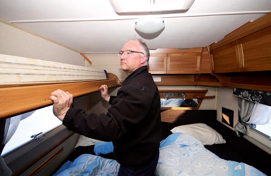 Inne i den minste vognen har familien Sæbø fire separate sengeplasser. Ragnar viser skapkøyen som minstemann Vegard sover i. Foto: Frank Skaufel