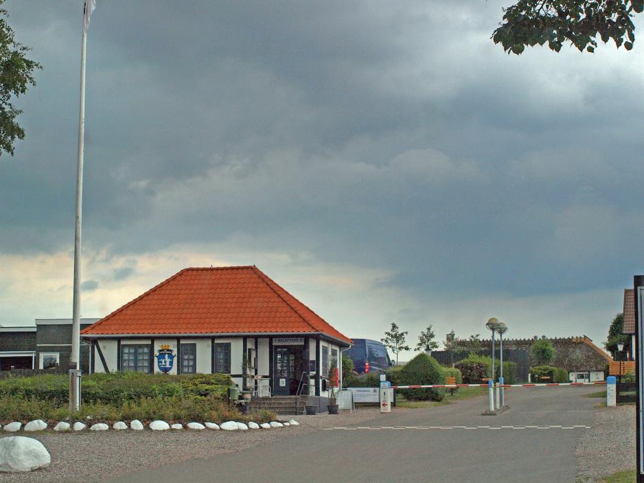 Dette er nok Danmarks minste campingplass. Plass til maksimalt 12 enheter. Resepsjonen er en liten disk i stuen. Hva er da dette, det står pent dekkede bord. Jo ved døren ses også et lite skilt hvor det står RESTAURANT DEN FULDKOMNE FISKER. Vi skal bli klokere. Vi vises inn til selve campingplassen, som består av et supergrønt gressteppe bak huset. Det er 16 A strømuttak og de sanitære rom finnes inne i huset. Ikke noe som er bygget i går, men det ble under vårt opphold gjort rent flere ganger daglig og alt virket perfekt. Dusj er gratis, selv om overnattingsprisen så absolutt hører til i den billige ende. Området innhegnet av høye og grønne trær. Det var vi glade for , da det på andre dagen blåste voldsomt opp til en meget frisk kuling.