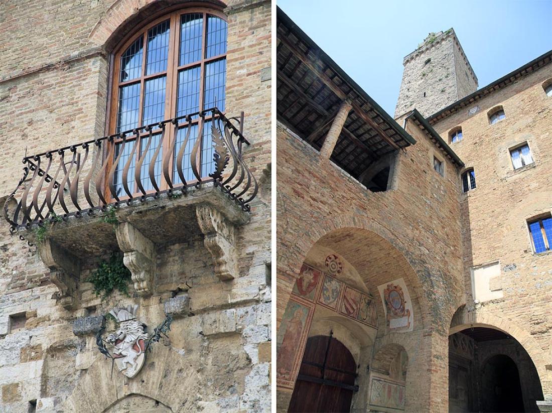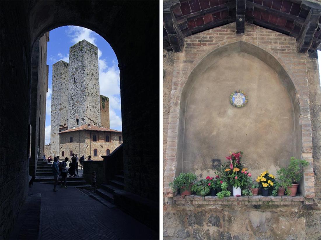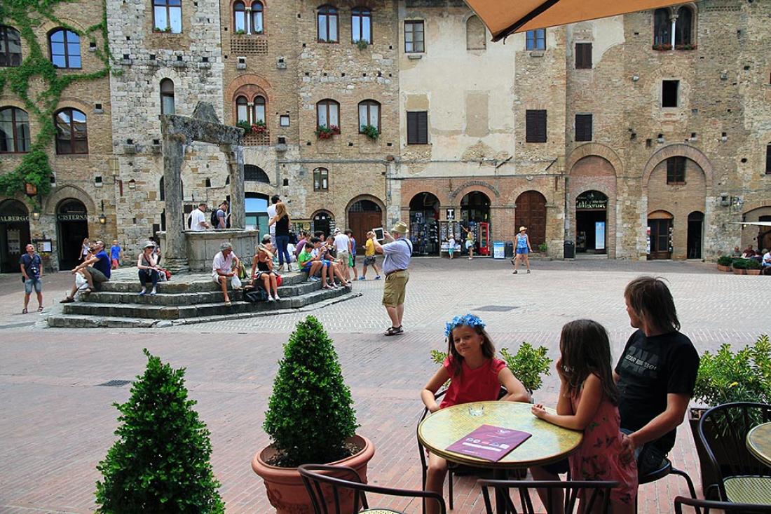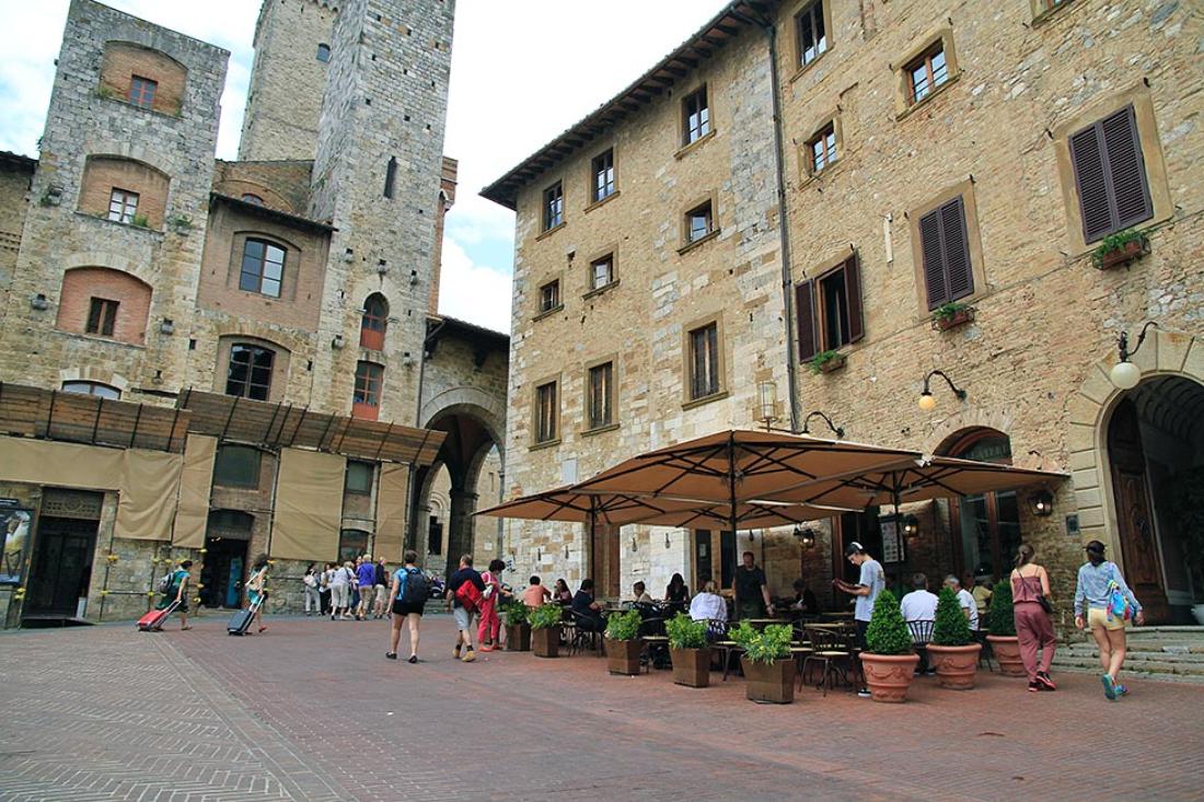 Vår reise startet for alvor i middelalderlandsbyen som typisk nok ligger på en høyde i et kupert terreng. De høye steinhusene ligger på typisk italiensk vis vegg i vegg, og gir svalende skygge til de smale gatene på sommerstid. Torget er intimt og sjarmerende og et naturlig sted å ta seg en pause på. Du får det som påstås å være ”verdens beste” is to steder, og hva passer vel bedre til en ekte italiensk espresso på kafeen? Byen er kjent som tårn-byen, og den spesielle byggeskikken har sin bakgrunn i krig og urolige tider på 1200-tallet. Det å ha et høyt tårnhus ga økt beskyttelse. De velstående familiene knivet seg imellom om å ha det høyeste tårnet, og på det meste hadde byen over 72 tårn, hvor de høyeste var hele 70 meter høye. Til slutt ble det vedtatt at ingen fikk bygge tårn høyere enn tårnet i Palazzo Comunale (kommunepalasset). Når en familie led nederlag i interne stridigheter eller en familie gikk konkurs, ble tårnet deres revet. I dag er det 14 gjenværende tårn. Bysentrumet står på Unescos verdensarvliste.